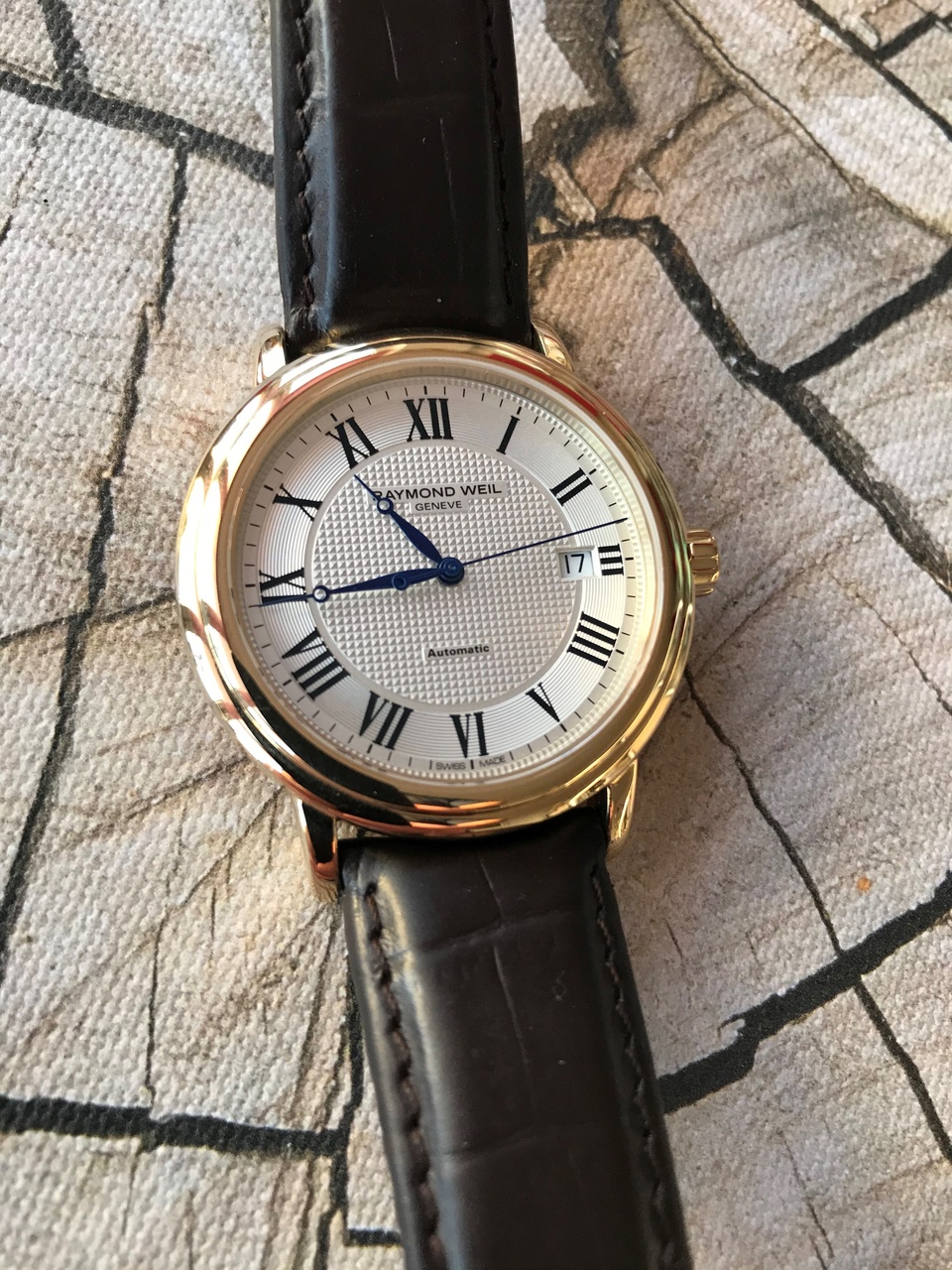 В наличии мужские часы RAYMOND WEIL Maestro 2837-PC-00659 в отличном состоянии, без потертостей. В комплекте: часы, инструкция, гарантийная карта/книжка, чек, кейс для документов.