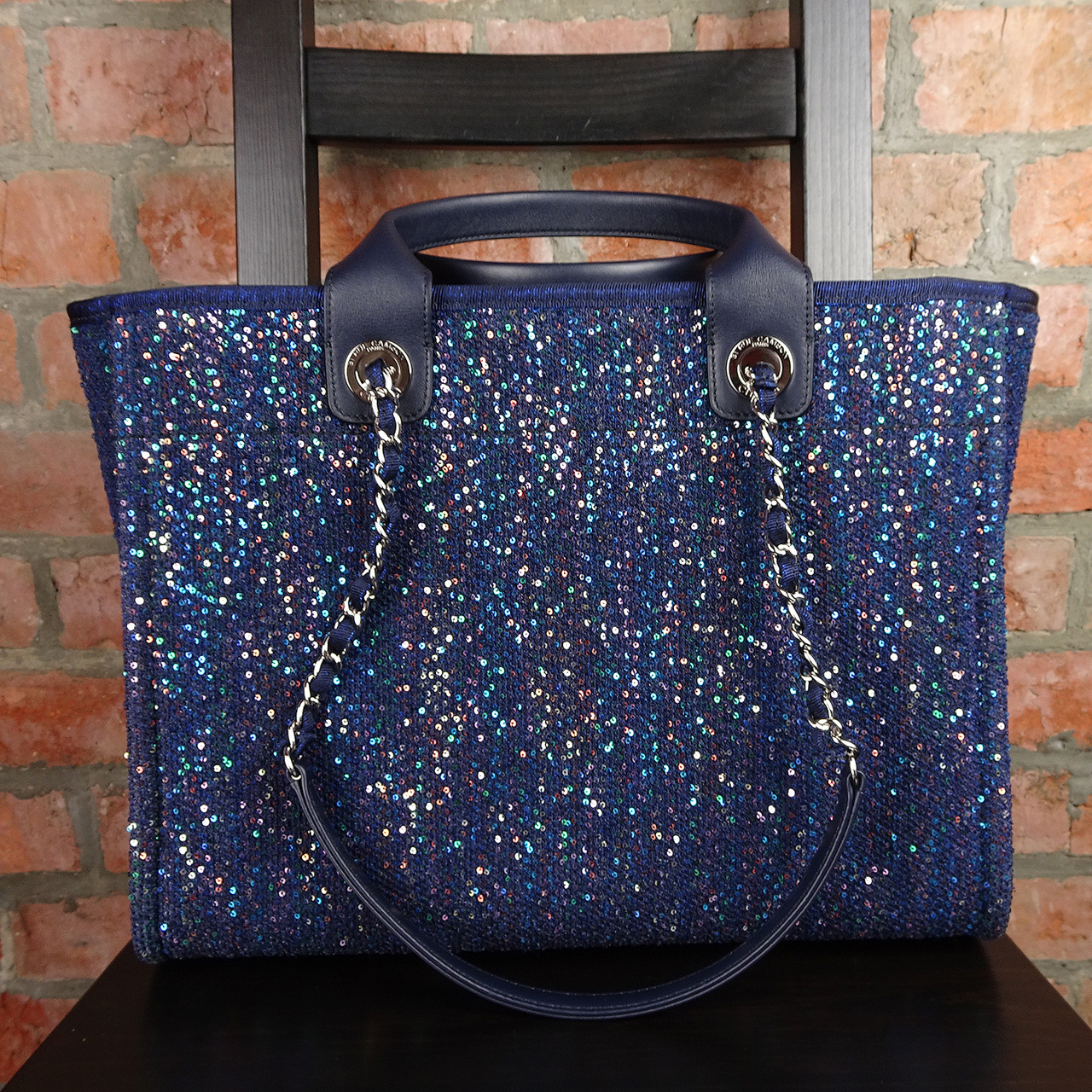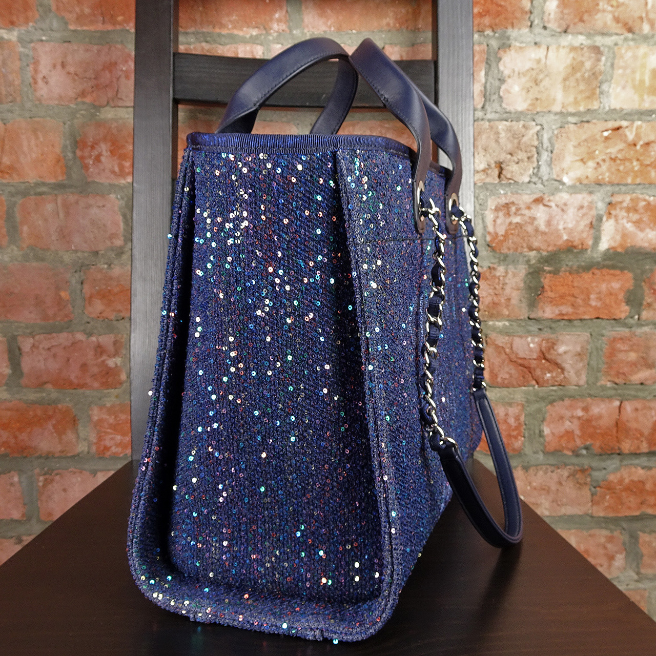 Также, удобство этой модели в наличии ручек помимо цепочек. Благодаря чему сумку можно носить в руках, на локте или на плече.