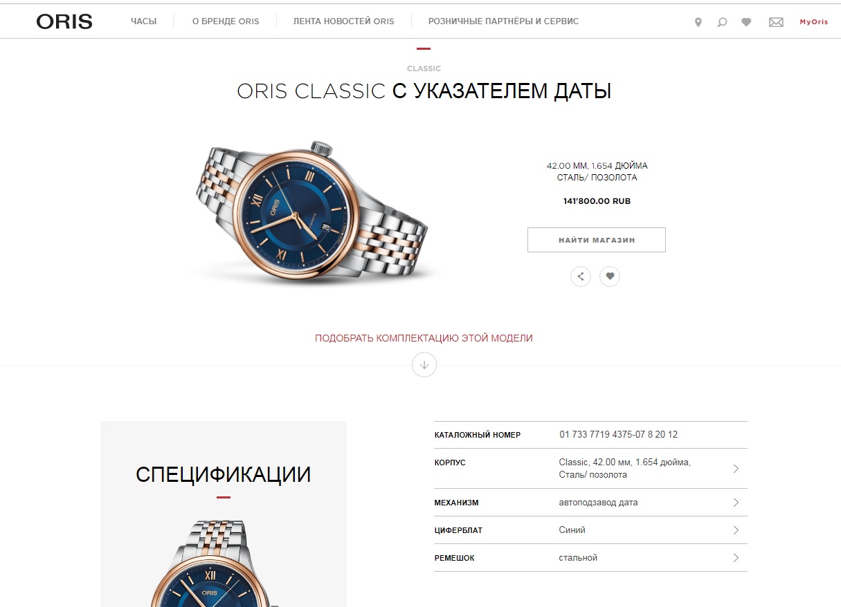 Калибр: Oris 733, на базе SW 200-1. Механизм: Механический с автоподзаводом. Корпус и браслет: Нержавеющая сталь с позолотой. Стекло: Сапфировое. Функции: Время, Дата. Водостойкость: 50 м (5 бар). Диаметр корпуса: 42 мм. Расстояние между ушками: 20 мм.