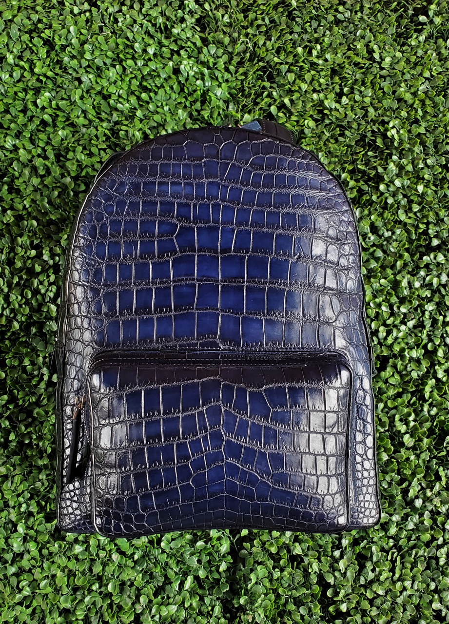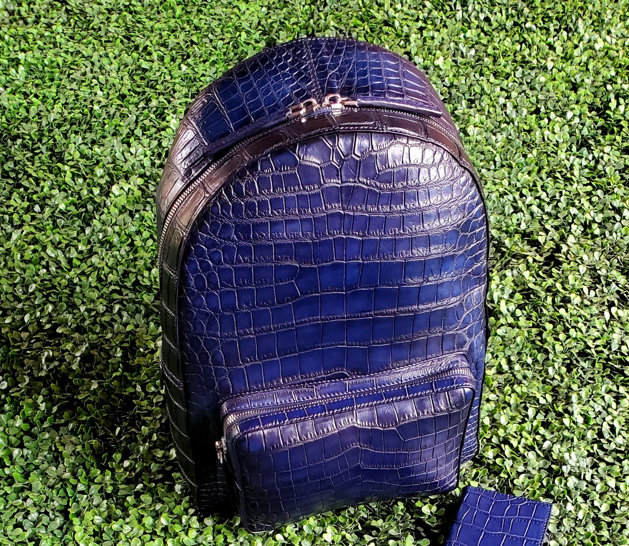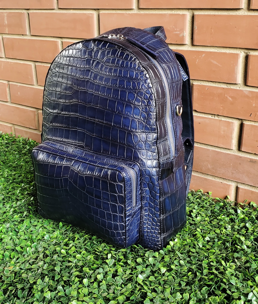Сзади рюкзак снабжен двумя регулируемыми плечевыми лямками из кожи крокодила тёмно-синего цвета.