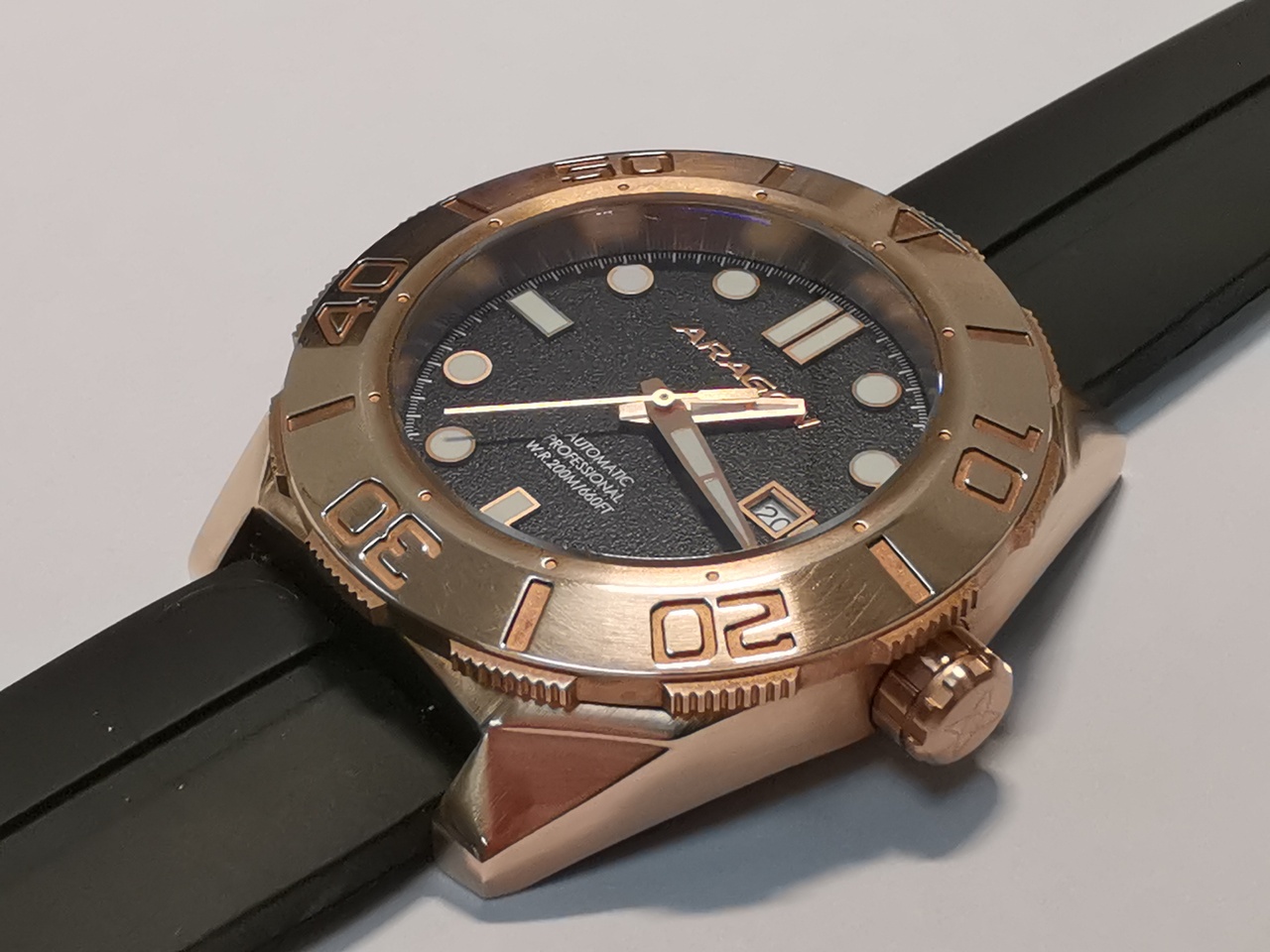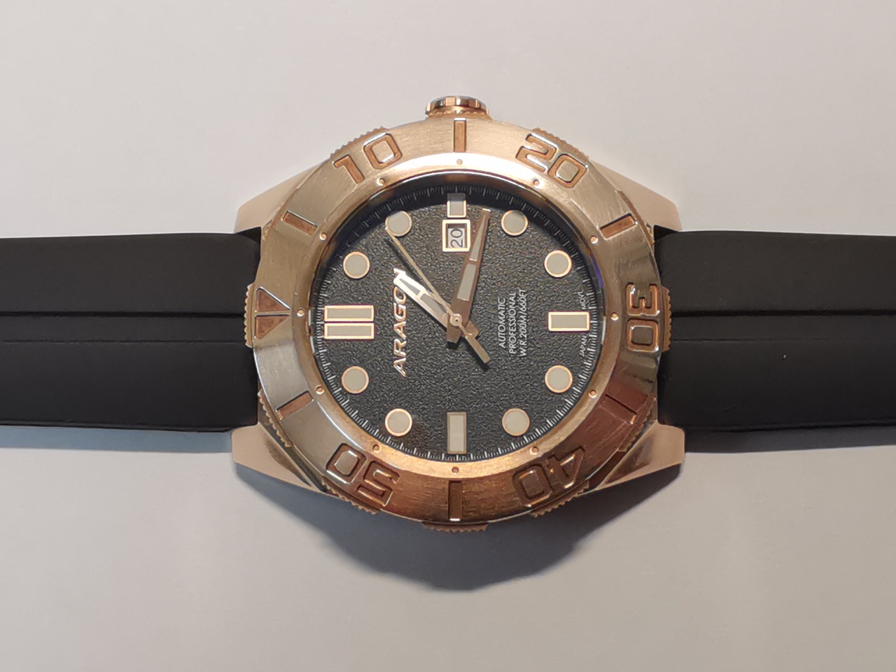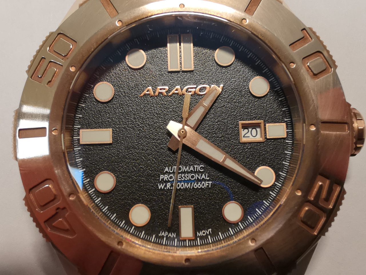 Циферблат черного цвета, возможно пластиковый, имеет мелкую шершавую текстуру "грубой листовой резины или рубероида". На циферблате, по периметру нанесена белой краской минутная разметка. Надпись Aragon, выполнена крупными золотыми с красновытым отливом буквами, курсивом, рубленым шрифтом. Надписи: Automatic,Professional, w.r.200m/660ft, japan mov't, выполнены рельефно белой краской. Окошко даты оформлено прямоугольной металлической рамкой золотого цвета.