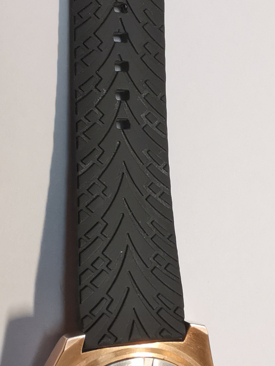 Ремешок силиконовый, снаружи гладкий с продольной углубленной полосой, а с внутренней стороны имеет текстуру напоминающую протектор шин. Бакля из стали, сатинирована, покрыта металлом цвета начищенной бронзы. Имеется надпись Aragon.