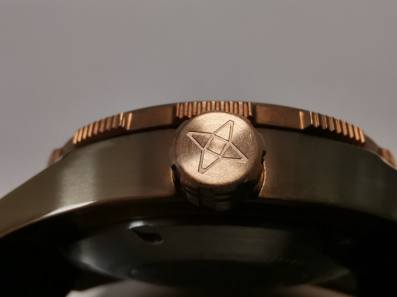 Заводная головка цвета начищенной бронзы, похоже, выполнена из стали, так как не имеет даже намека на окисление. Головка завинчивается, водозащита у часов, заявлена в 20 бар. Головка цилиндрическая с фрезерованными зубчиками и перпендикулярной углубленной линией. С вершины снята фаска, и нанесен крестообразный геометрический рисунок, символ бренда.