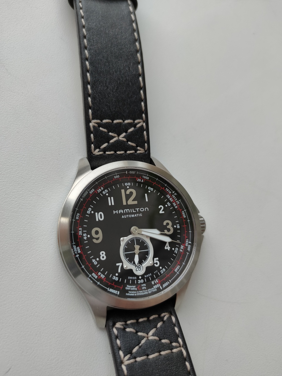 В продаже редкий пилот в неизбитом дизайне от уважаемого производителя. Модель, над которой дизайнеры потрудились на славу. В моменты скуки и лени, сняв их с руки, можно долго изучать все фишки и полезности дизайна данной модели. Чего только стоят шкала измерения давления и высоты, прозрачная задняя крышка с металлической полосой по центру с выгравированным на ней авиационным алфавитом и малая секунда, оформленная в виде приборной доски самолета