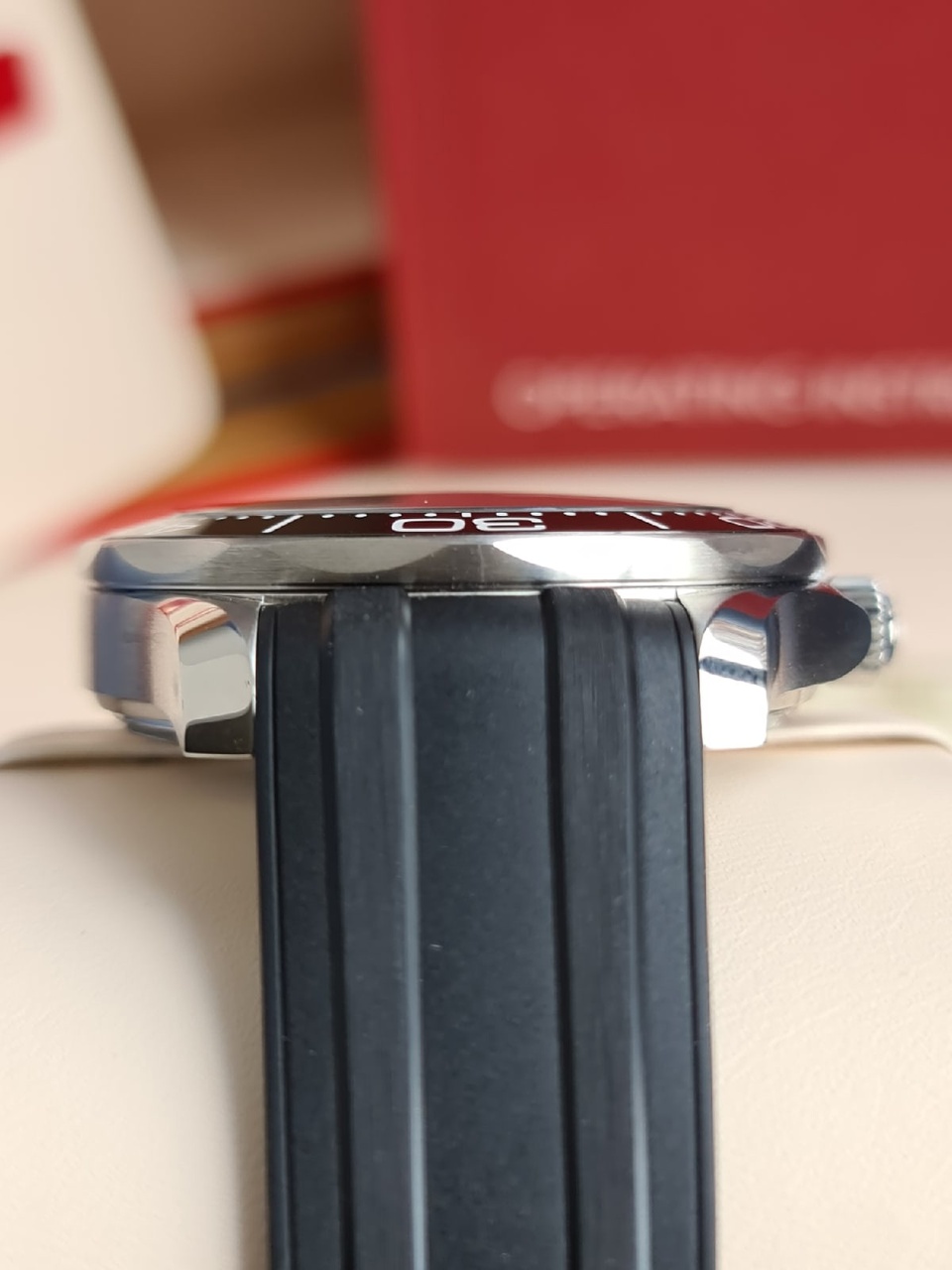 Оформление: Сертификат мастер-хронометра METAS. Выпуклое стекло с антибликовым покрытием, однонаправленно вращающийся безель и циферблат - керамика, завинчивающаяся заводная головка, гелиевый клапан. Механизм с коаксиальным спуском, запас хода на 55 часов, антимагнитные