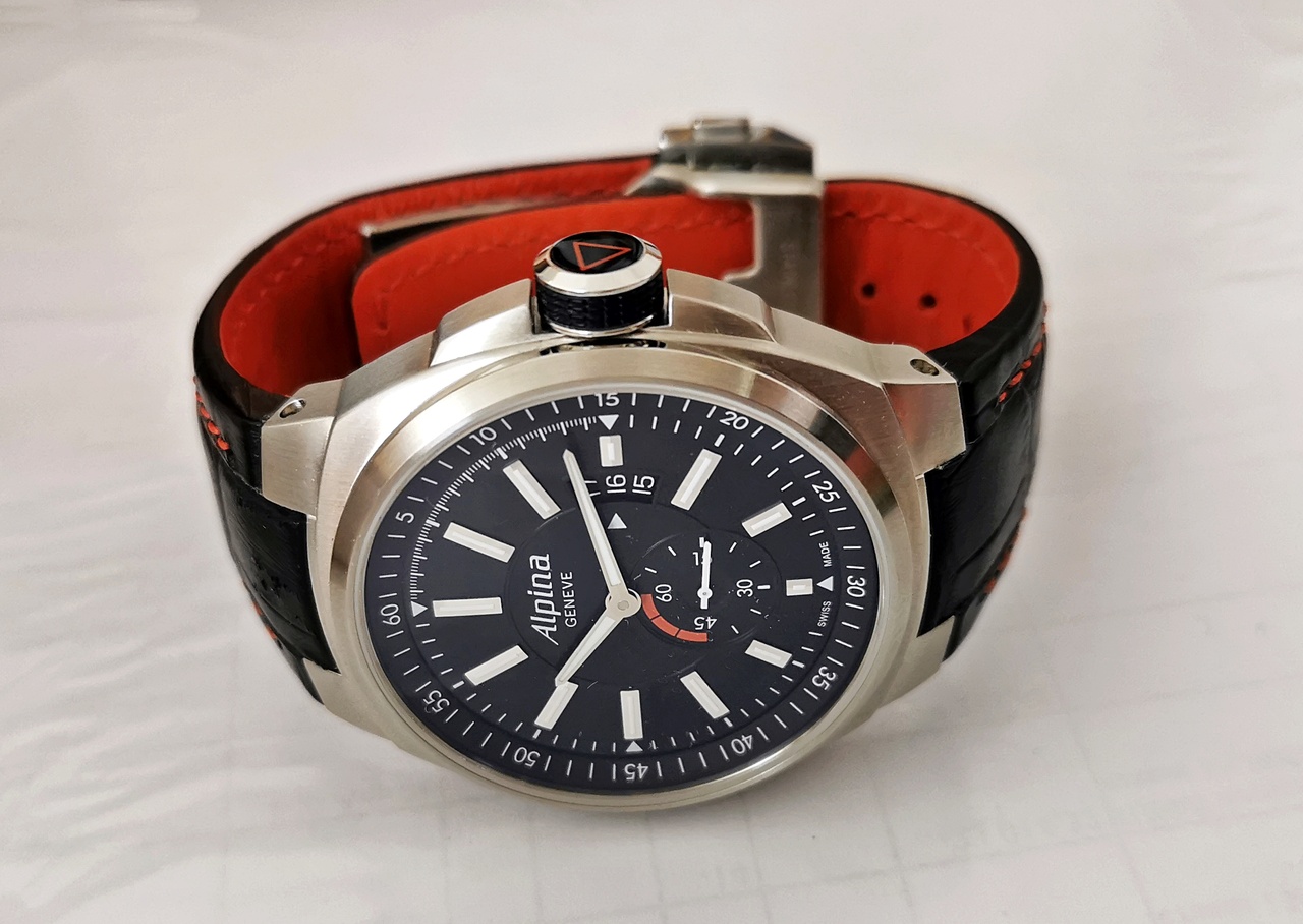 В продаже мужские часы Alpina модель Racing Level 5 Motorsport в 47мм размере корпуса, зг на резьбе, сапфировое стекло, автоподзавод, 10атм водозашиты, клипса на кожаном ремне , в комплекте только часы и инструкция с биркой, пустой гарантийный талон, коробки нет. Ход в пределах нормы, в среднем +8-9/сутки. Ремешок как новый, крепление на нём подклеивалось, пока ношу изредка всё в порядке, на часах пару-тройку микроволосиков и всё, в остальном все отлично.