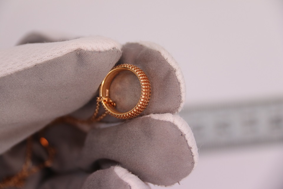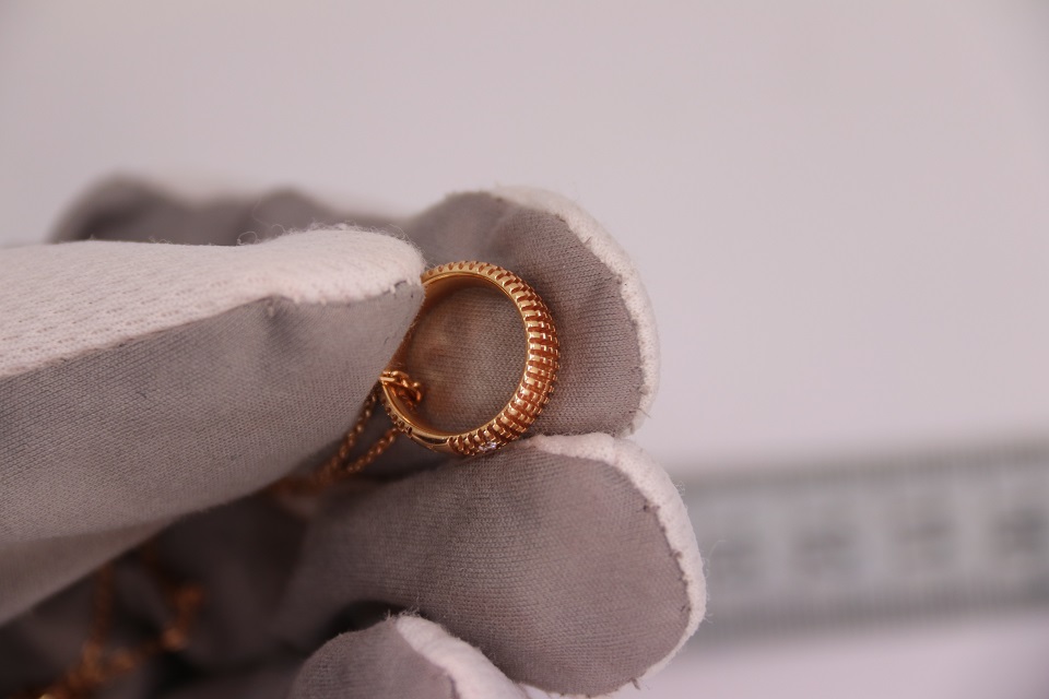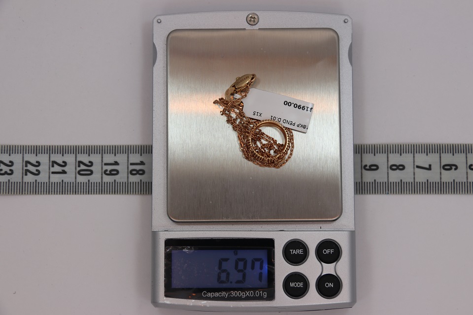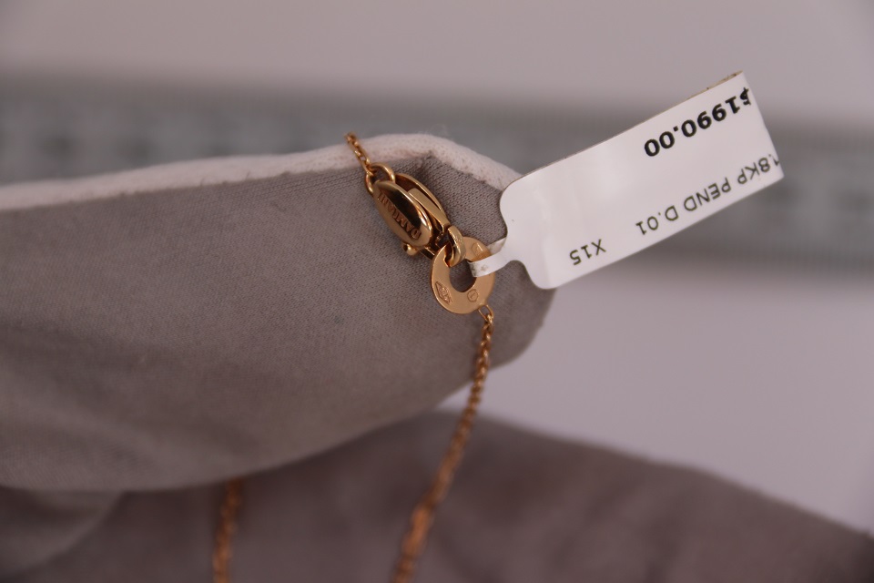 Один бриллиант в застежке, кулон украшен вторым бриллиантом.