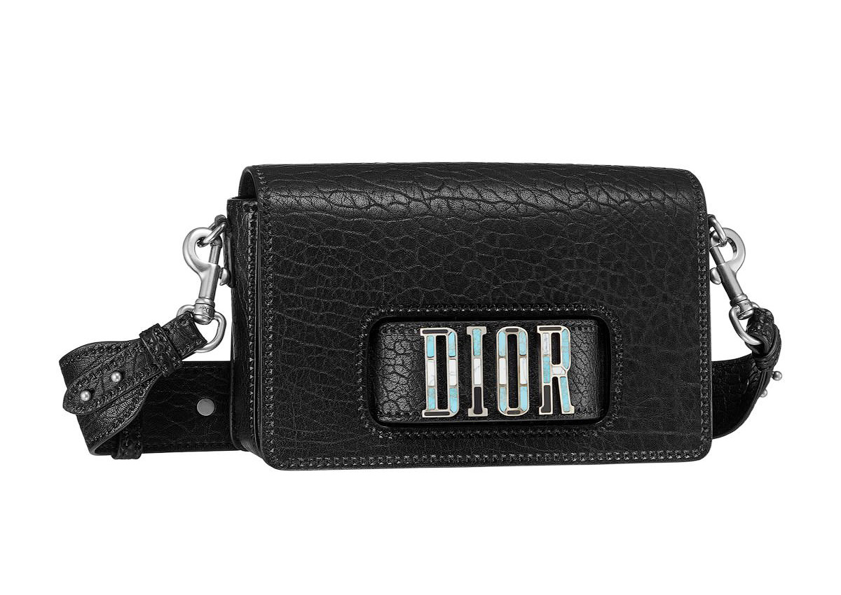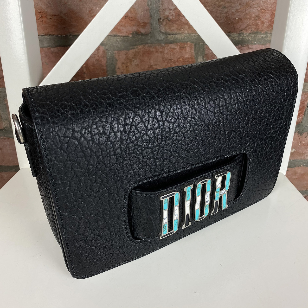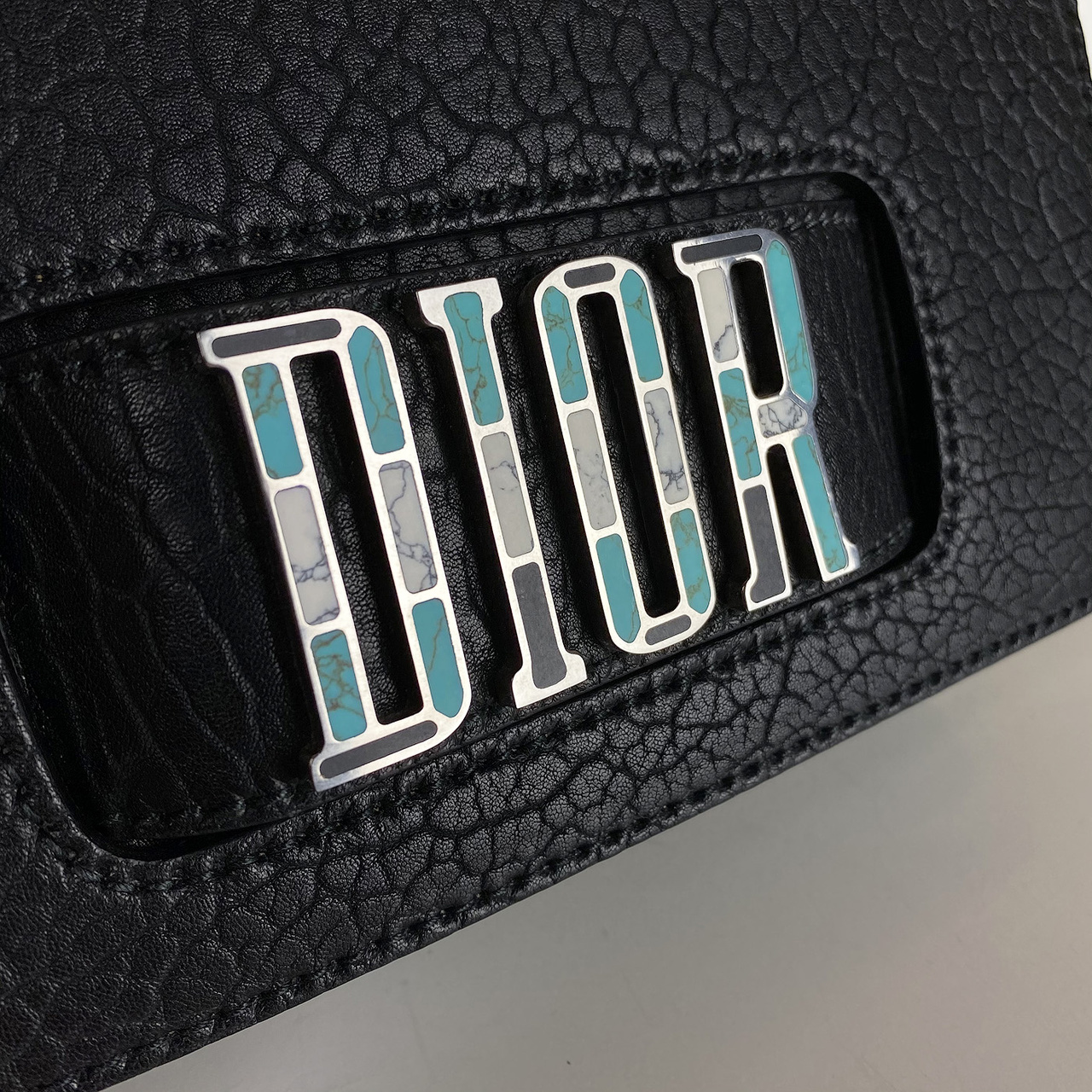 лого DIOR спереди сумки выполнено в технике мраморной мозаики в бирюзово-бело-черных тонах. У не-лимитированных сумок это лого просто металлическое.