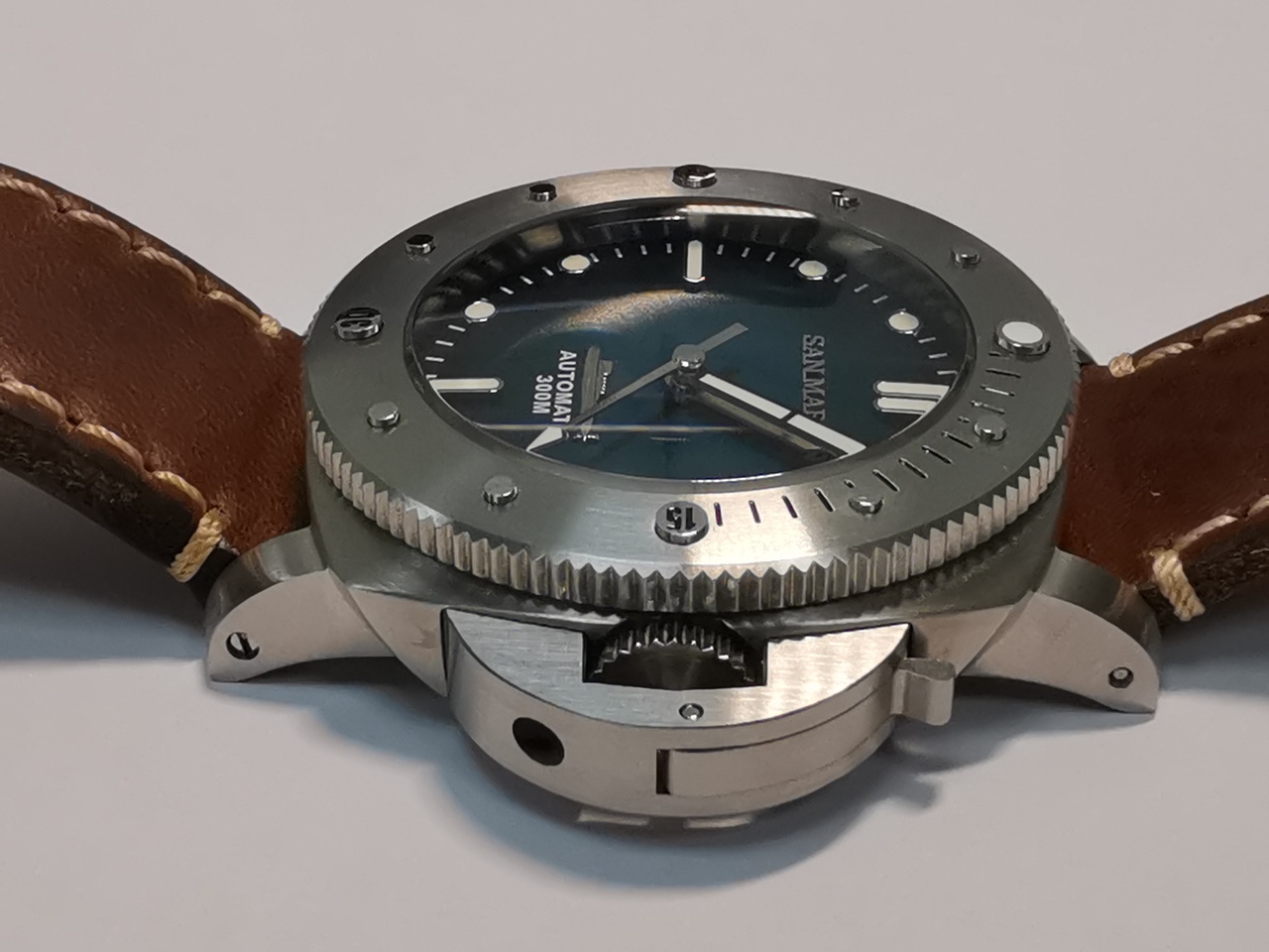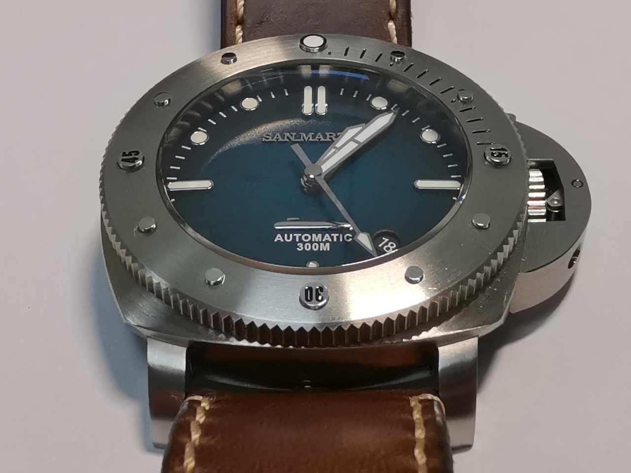 Больше года назад на летней распродаже мне довелось приобрести давнюю хотелку, - хомаж Пама от Сан Мартина. Самым удачным цветом циферблата, судя по фотографиям официального сайта, мне показался градиентный синий. Он очень удачно сочетается с цветом металла и подчеркивает "морскую" тематику модели. Долго у меня не было настроения написать отзыв по данным часам, и, вот почему: часы редко оказывались у меня на руке. Одна из причин этого, как ни странно - жалко поцарапать такую красоту. Но, как оказалось, есть, кроме красоты и минусы у этой модели. Во первых, запаса хода установленного в этих часах механизма PT5000 , от автоподзавода, при ношении на руке, хватает на сутки с небольшим(кто-то, где-то писал про 30 часов). То есть, их надо носить каждый день, в период интереса к ним.