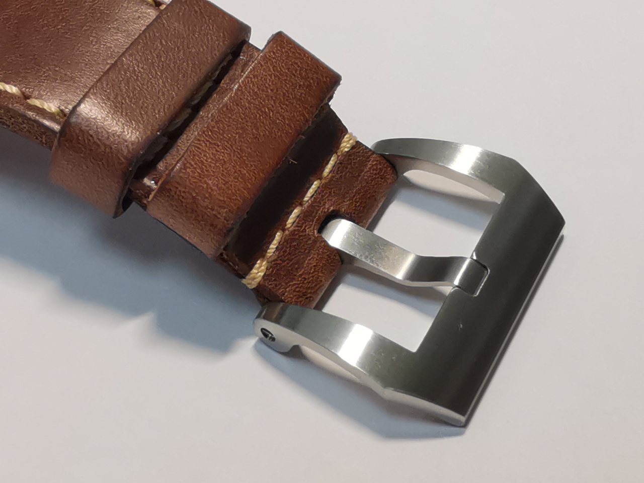 Ремешок из натуральной кожи, толщиной 3,5мм, установлен на шпильки с резьбовым креплением. Ремешок имеет хорошую пропитку от намокания. Небольшой запах кожи присуствует.