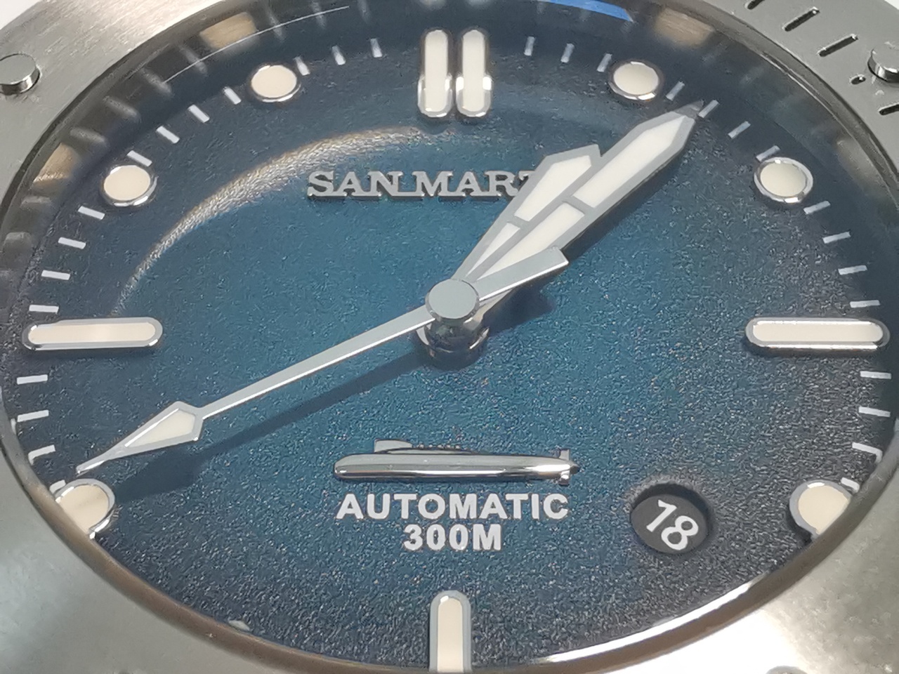 Стекло над циферблатом сапфировое, полукупольное. Циферблат утоплен в колодце с вертикальными стенками на 3,5-4мм. Поле циферблата ровное с шершавой текстурой. Окраска градиентная: от синевато-серого центра к темно-серым краям. Часовые метки накладные, выполнены в виде круглых и овально-вытянутых серебристых оправок, заполненых люмом. Минутная разметка выполнена белыми черточками по периметру циферблата. Брендовая надпись San Martin, накладная, выполнена рельефными хромированными буквами. В нижней части циферблата присутствует рельефное, накладное изображение подводной лодки, и надпись белой краской под ним - Automatic 300m. Окошко даты круглое, неоформленое. Дата на черном фоне, сочетается с циферблатом.