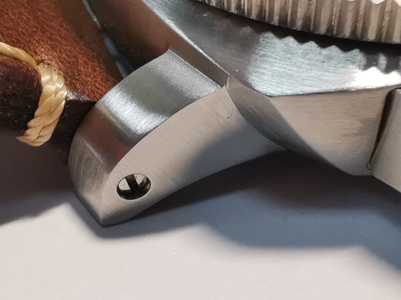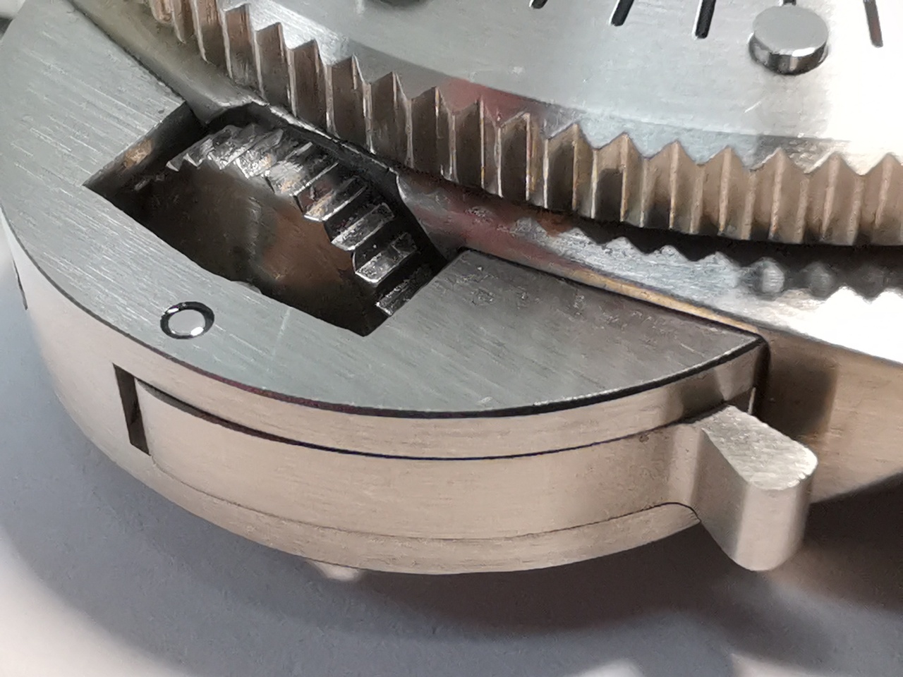 Заводная головка плоская с частыми полированными насечками по гурту. В отличие от бронзовой лимитки, в данной модели головка хорошо подцепляется пальцами, и не задевает за безель. управлять головкой довольно удобно. Мост-блокиратор головки выполнен надежно, имеет толщину 6мм. Рычаг моста с некоторым усилием открывается и закрывается, что наводит на мысль о надежном прижиме. В бронзовой версии мост тоньше(около 5мм), и рычаг свободно открывается даже от контакта с рукавом.(в моём экземпляре)