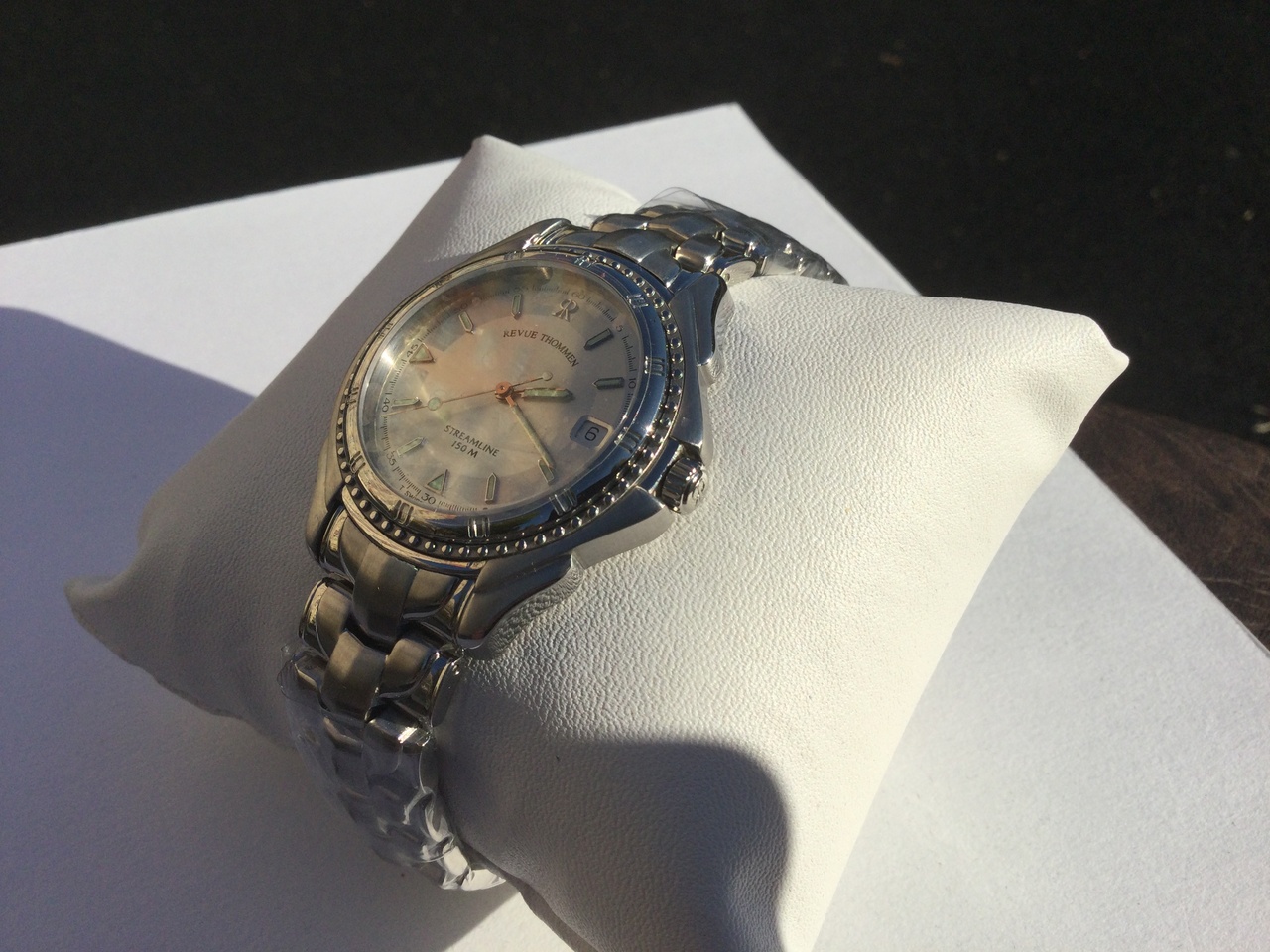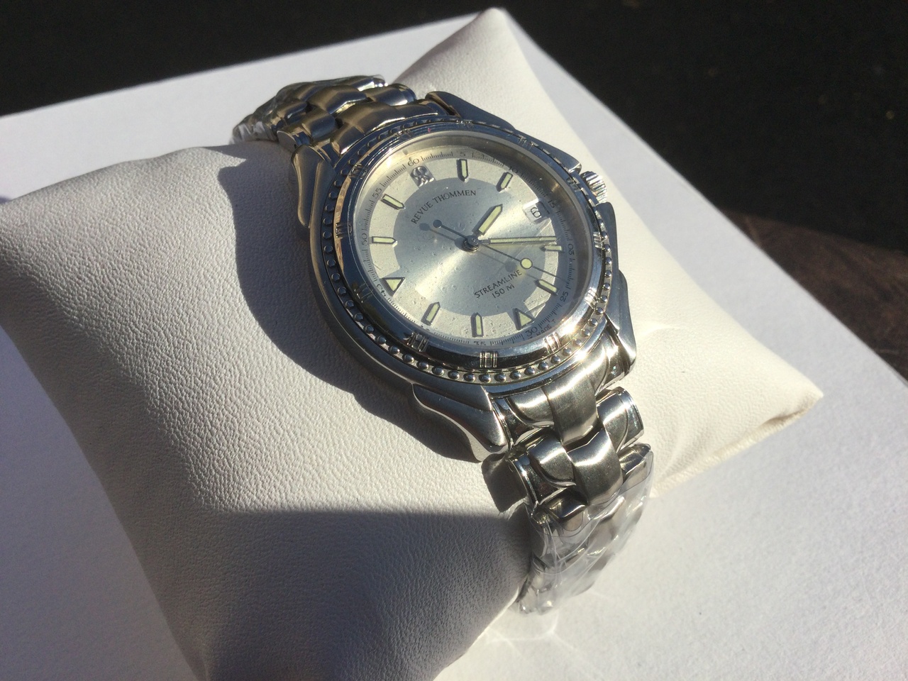 Настоящая Швейцария Revue Thommen Streamline Quartz , NOS- новые после хранения , в пленках , дорогой кварцевый механизм с камнями , перед покупкой установлена новая батарейка , цвет гильешированного циферблата — белый / серебро , sunburst effect , тритиевые накладные метки , сапфировое стекло , завинчивающаяся заводная головка , вононепроницаемость —150 метров ,