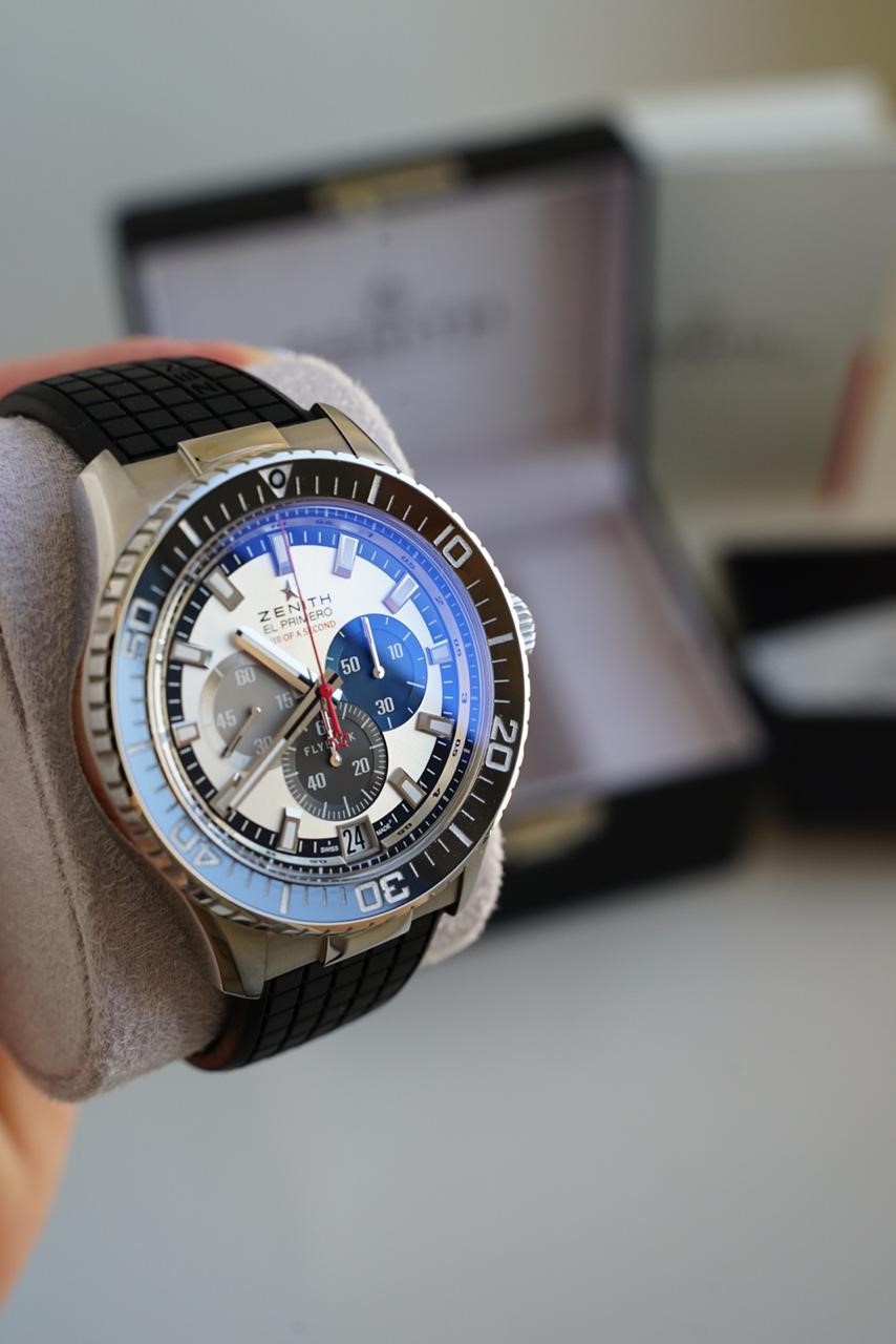 Первые часы, преодолевшие звуковой барьер на границе открытого космоса. Эксклюзивный индикатор десятых долей секунды: стрелка хронографа совершает один оборот за 10 секунд. Задняя крышка с логотипом проекта Stratos и девизом Феликса Баумгартнера. Корпус вращающийся в одном направлении ободок из стали с диском из черной керамики. Циферблат серебристый, с отделкой гильоше «Солнечные лучи» и счетчиками трех разных цветов. Метки и стрелки фасетные, из родия, с люминесцентным покрытием Superluminova SLN C1. Механизм El Primero 4057 B, автоматический, диаметр 30мм, толщина 6,6 мм, 326 деталей на 31 драгоценном камне с частотой баланса 36000 полуколибаний в час с запасом хода 50 часов. Ротор с отделкой «Côtes de Genève». Центральные часовая и минутная стрелки. Маленькая секундная стрелка на отметке «9 часов». Индикатор даты на отметке «6 часов». Хронограф с функцией Flyback и индикацией десятых долей секунды: 60-минутный счетчик на отметке «6 часов», 60-секундный счетчик на отметке «3 часа», индикация десятых долей секунды осуществляется стрелкой хронографа. Ремешок из каучука.Тройная раскладывающаяся застежка из стали.