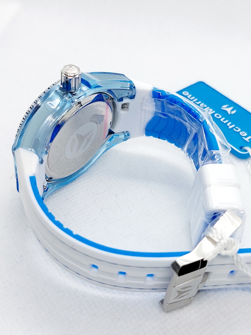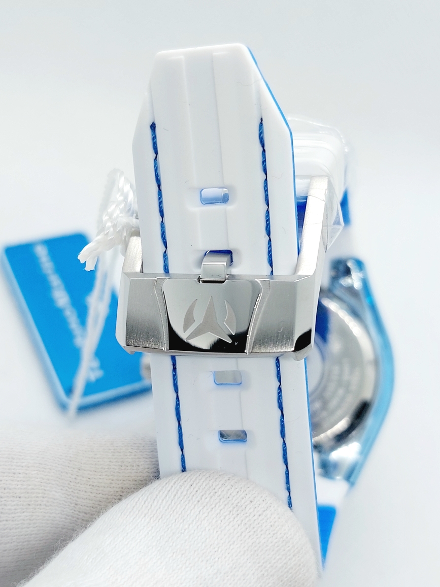 Часы комплектуется силиконовым ремешком бело-синего цвета с классической застежкой на которой нанесен логотип бренда.