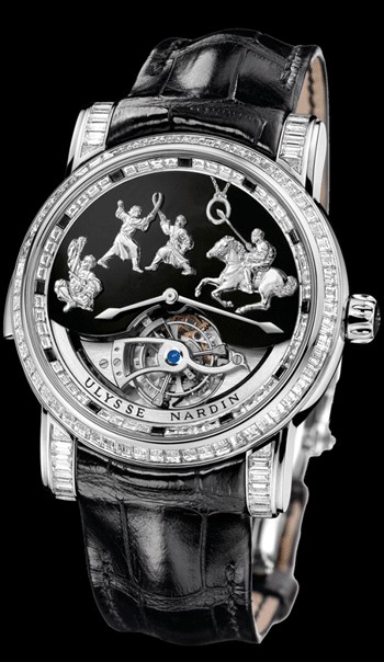 Но вершиной мастерства часовщиков Ulysse Nardin является модель Genghis Khan Haute Joaillerie, которая стала первыми в мире часами с турбийоном и минутным репетиром с Вестминстерским боем и фигурками-жакемарами, вырезанными вручную из розового или белого золота. Каждый из 4 гонгов настроены в своей тональности и отбивают четыре ноты (ми-до-ре-соль) в разной последовательности для разных четвертей часа, а фигурки музыканта, воинов и совершают движения в такт боя.