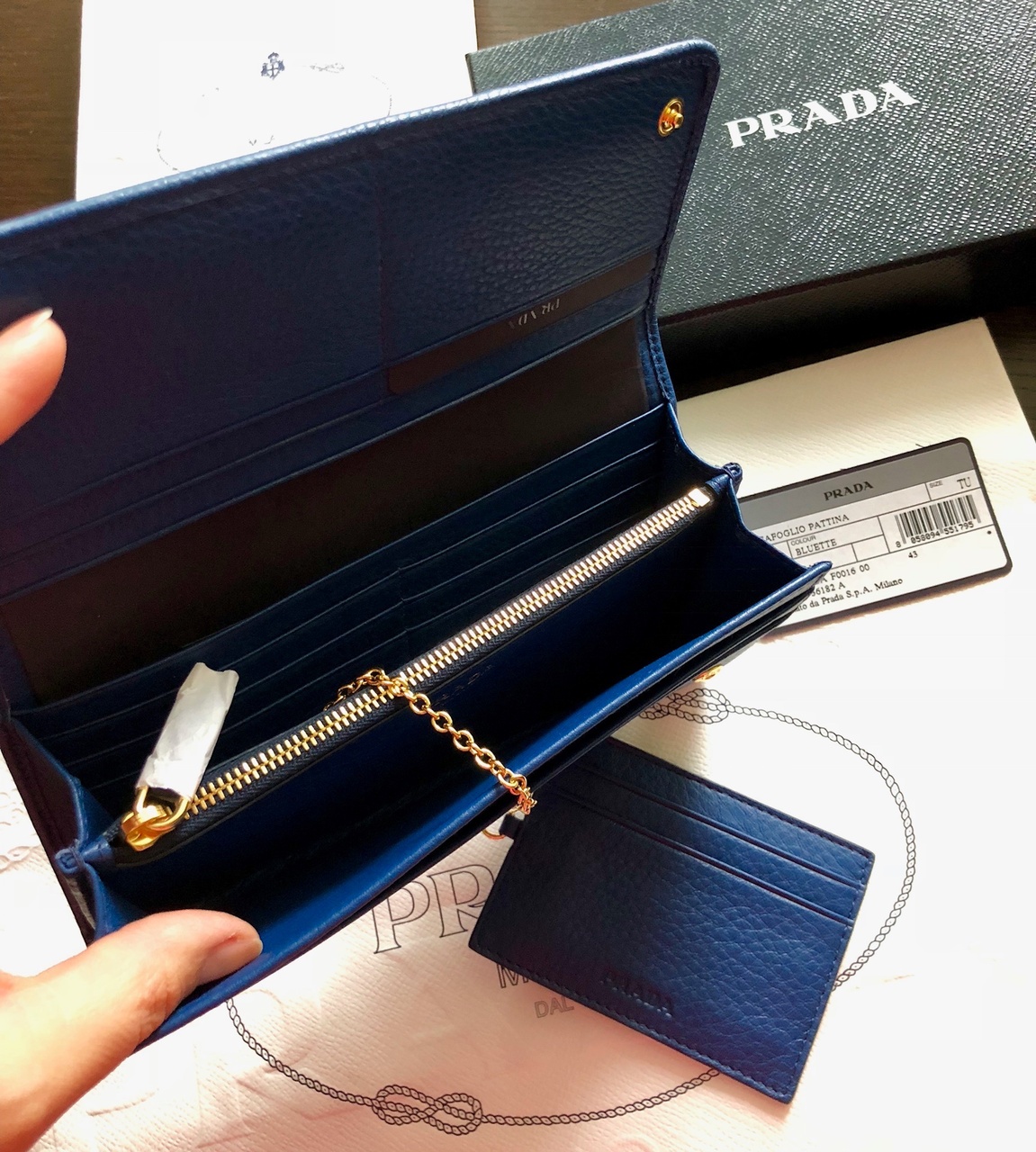 Классическая, всегда актуальная модель, со встроенной визитницей (отдельно визитницы у PRADA стоят не менее 12-14т.р). Портмоне полноценного формата, 19 на 9,5 см. Мягкая зернистая кожа, выделки Vittelo Grain, очень ноская и стойкая к царапинам, насыщенного темно-синего цвета (BLUETTE). На клапане металический золотой лого бренда, золотая фурнитура.