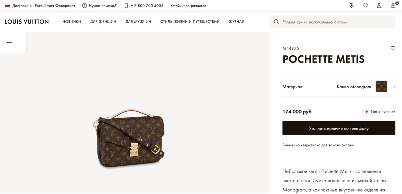 Стоимость в Louis Vuitton: 174.000 руб. Редко появляется в наличии в бутиках! На всю Россию их привозят всего пару штук в месяц.