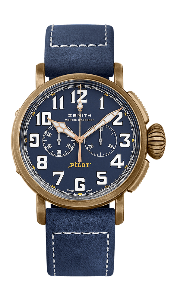 Pilot Type 20 Extra Special Chronograph Bronze в бронзе 45 мм, со временной патиной, в сочетании с циферблатом синего цвета и крупными люминесцентными арабскими цифрами и стрелками. Винтажный дизайн обретает полную завершенность благодаря синему ремню из нубука. Часы оснащены автоматическим механизмом с высокочастотным хронографом El Primero.