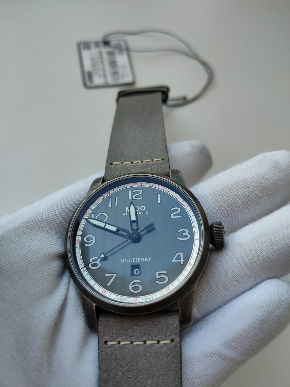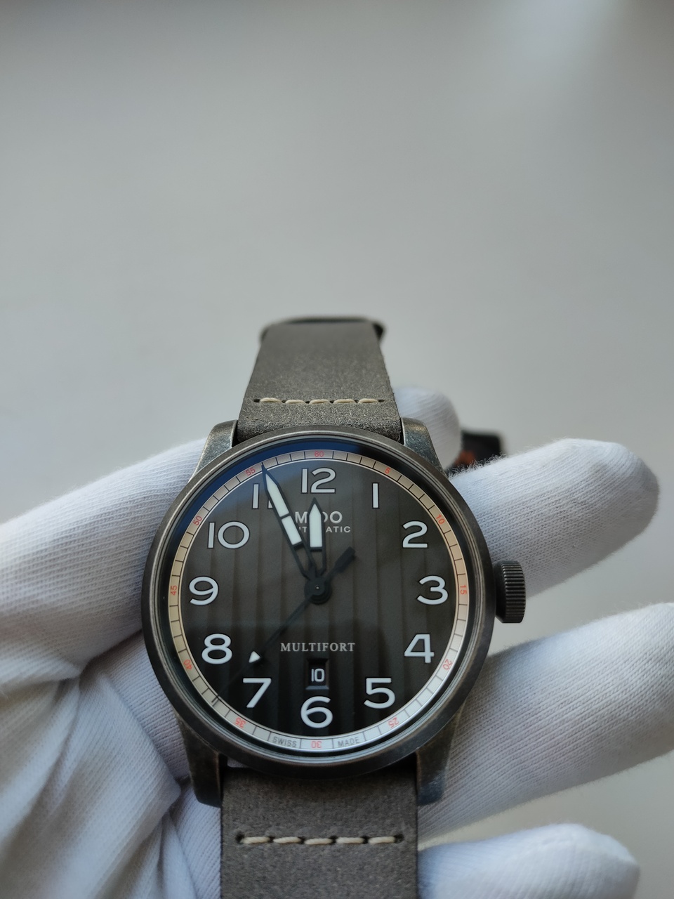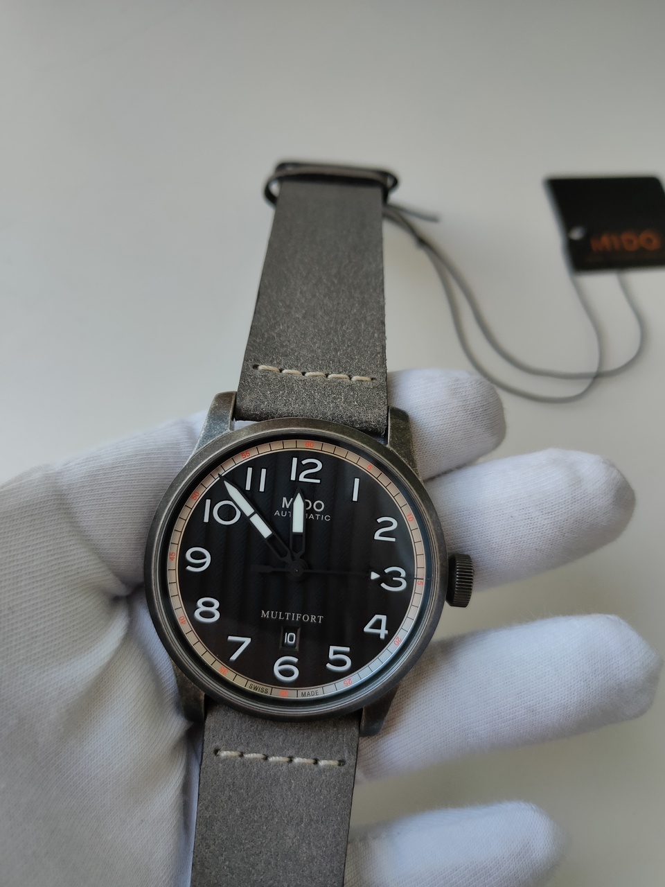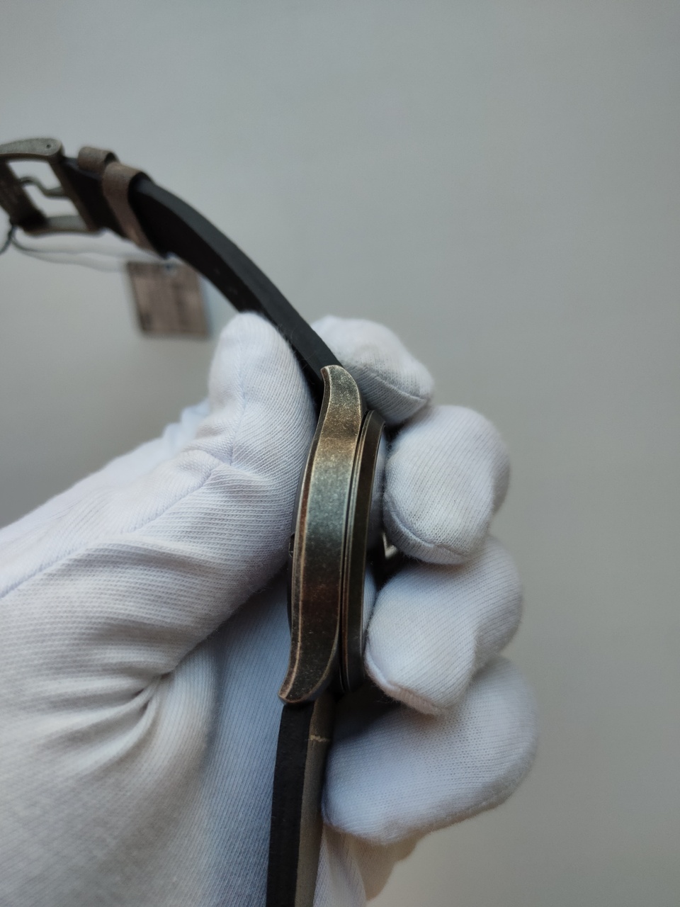 В продаже редкая и очень классная модель от уважаемого производителя. Корпус диаметром 44 мм из нержавеющей стали с черным PVD-покрытием, прошедшим пескоструйную обработку для создания «состаренного» вида. Подобная обработка корпуса и бакли выглядит на уровне плюс позволит скрыть мелкие потертости, появляющиеся от ежедневной носки. Цифер с вертикальным сайдингом, придающим объем и арабскими цифрами. Отличный люм на всех стрелках и цифрах. Мягкий кожаный ремешок серого цвета с выделкой под замшу, отлично гармонирующий с часами. Плюс ко всему, надежный и точный калибр с 80 часовым запасом хода. По критериям цена / качество конкурентов с подобной начинкой, интересным дизайном и уровнем отделки найти будет непросто