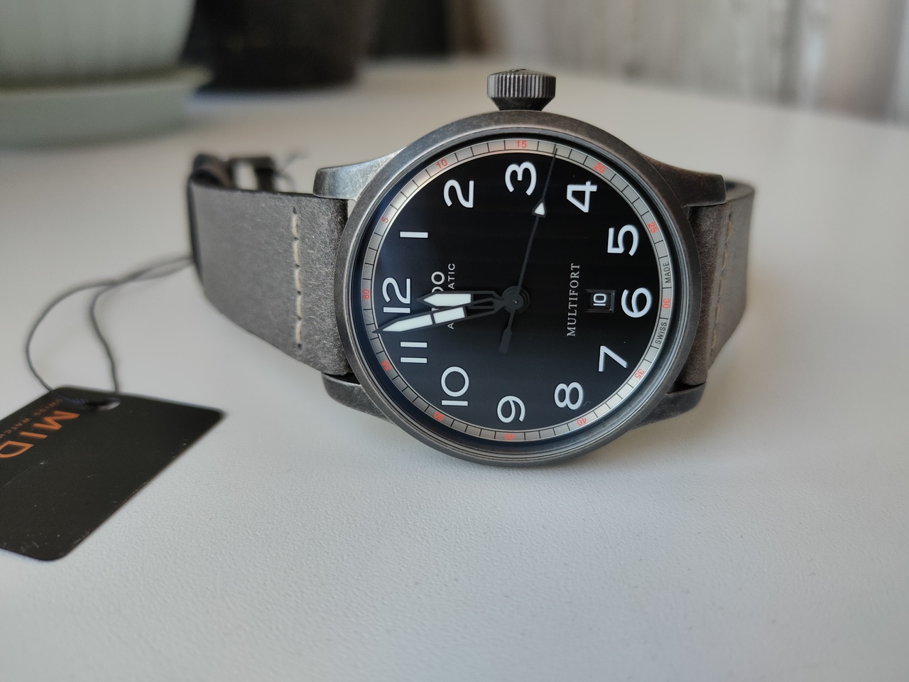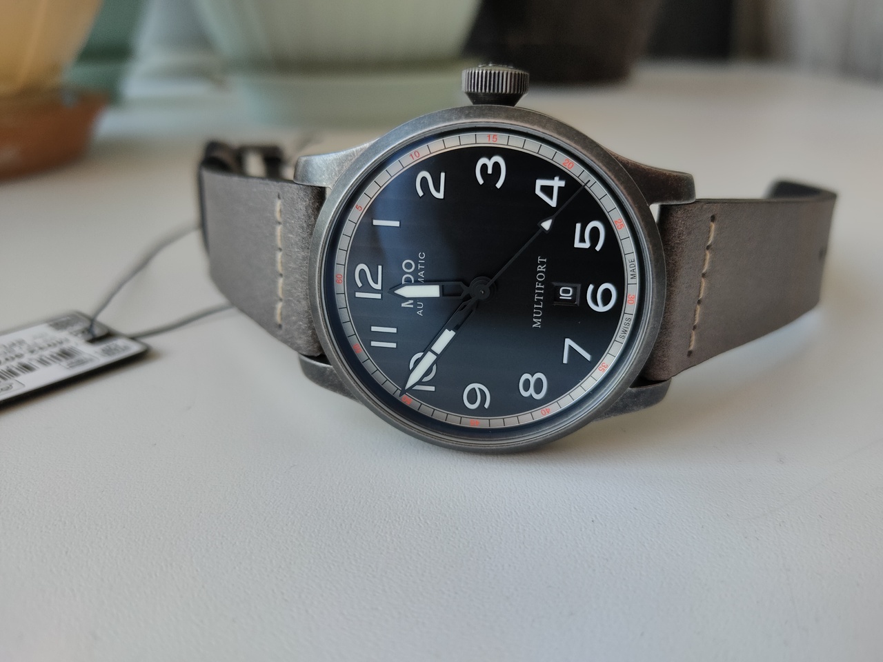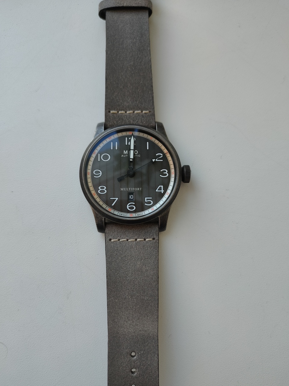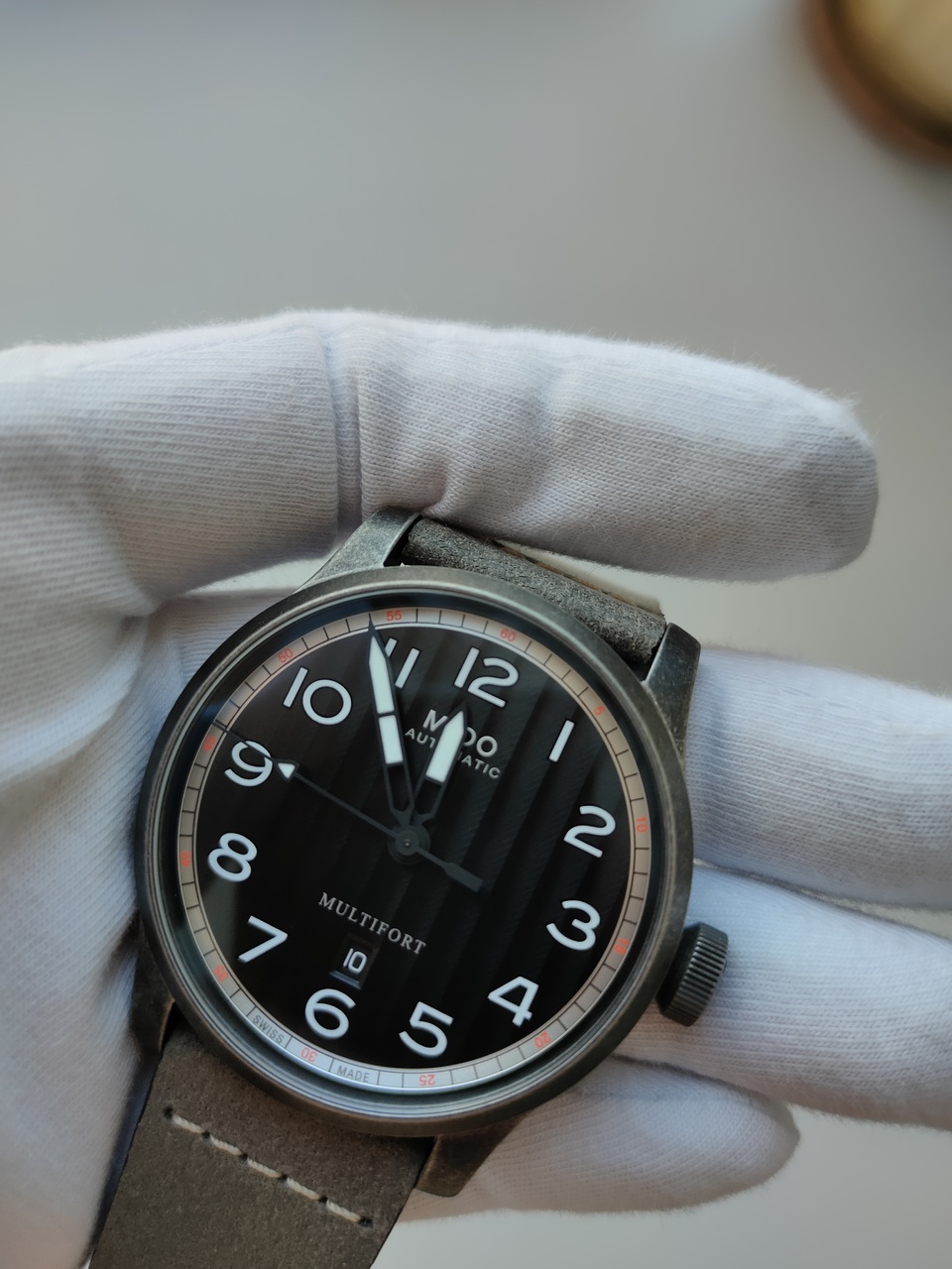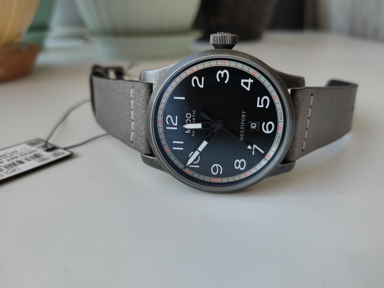 В продаже редкая и очень классная модель от уважаемого производителя. Корпус диаметром 44 мм из нержавеющей стали с черным PVD-покрытием, прошедшим пескоструйную обработку для создания «состаренного» вида. Подобная обработка корпуса и бакли выглядит на уровне плюс позволит скрыть мелкие потертости, появляющиеся от ежедневной носки. Цифер с вертикальным сайдингом, придающим объем и арабскими цифрами. Отличный люм на всех стрелках и цифрах. Мягкий кожаный ремешок серого цвета с выделкой под замшу, отлично гармонирующий с часами. Плюс ко всему, надежный и точный калибр с 80 часовым запасом хода. По критериям цена / качество конкурентов с подобной начинкой, интересным дизайном и уровнем отделки найти будет непросто