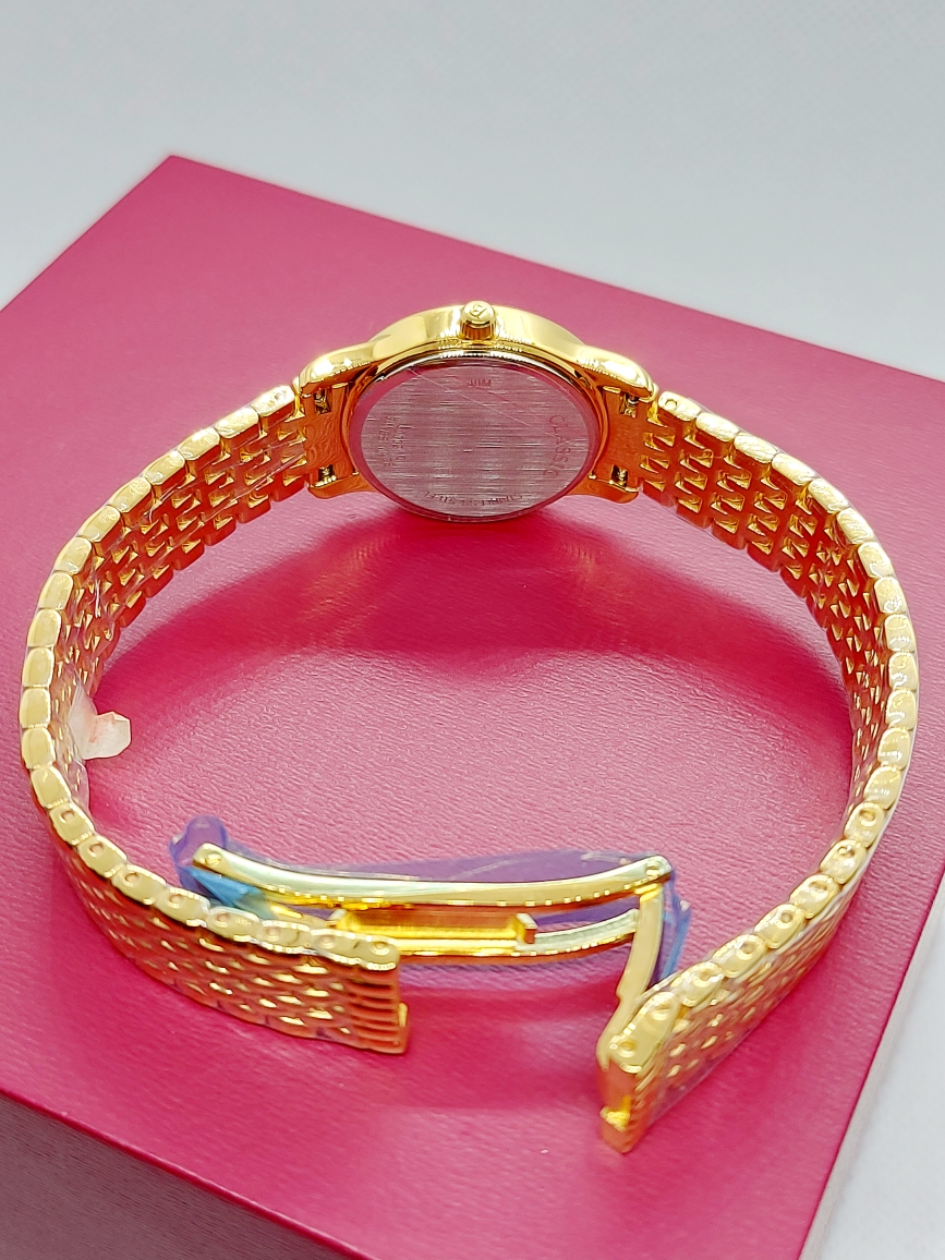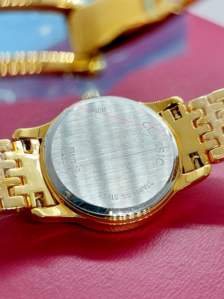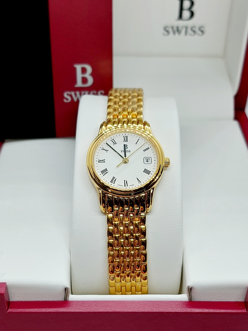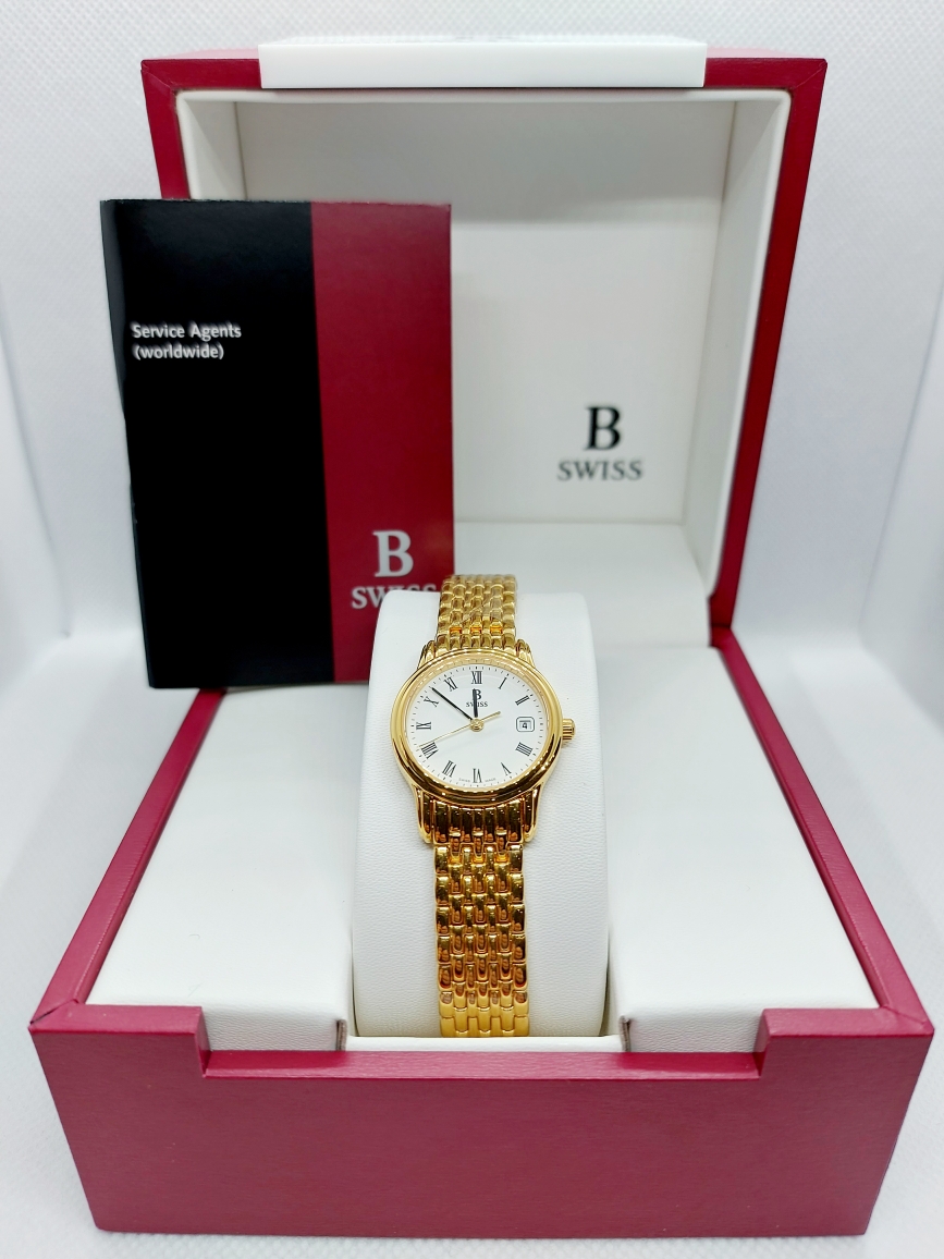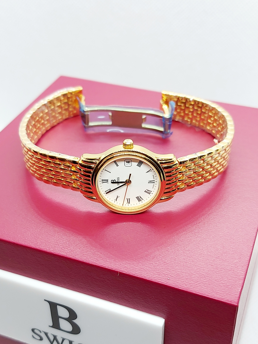 B Swiss оснащены браслетом золотистого цвета из нержавеющей стали с застежкой бабочкой.