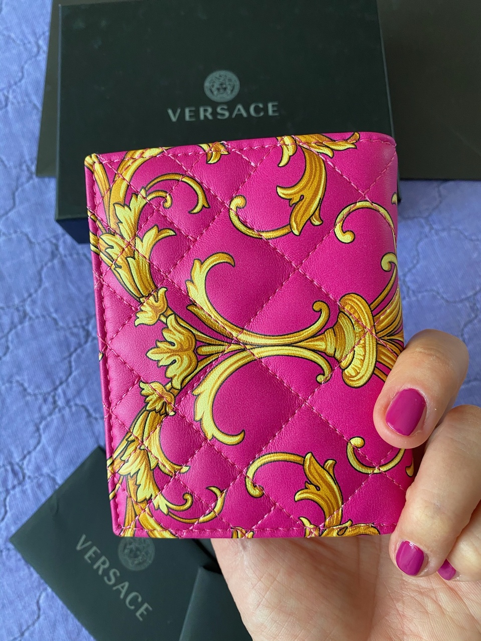 VERSACE. Женский кошелек. Среднего размера, на кнопке. НОВЫЙ. Гладкая стеганая кожа. Расцветка: розовый-фукси с золотым барокко