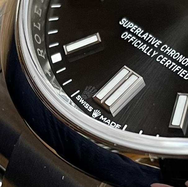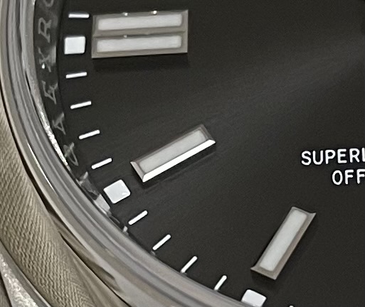 Ну ладно думаю, буду искать новый OP. Позвонил в Меркури просто в колл-центр, оставил заявку, мне перезвонили и сказали что есть OP 36 mm с черным циферблатом (мол вот только привезли). Взял лупу, невозмутимость, кофе и поехал. Ну и произошло чудо: все буквы идеально пропечатаны, пыли нет, все грани всех меток отполированы идеально без зазубрин, люм залит ровно, штифты браслета исполнены очень аккуратно, шлицы штифтов не "завалены" полировкой, в общем по тем параметрам, которые значимы для меня (именно для меня, а не вообще по всем) они оказались идеальными. Ну и купил, еще и по "ритейлу" если я правильно понимаю все.