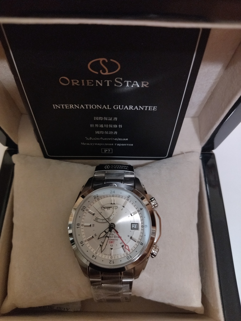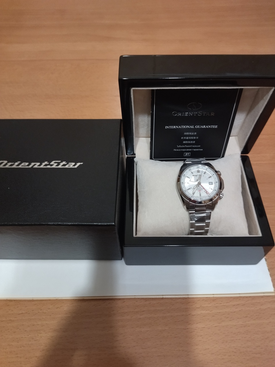 Продам мужские механические часы Orient Star( made in Japan ).Новые(в пленках).Часы с автоподзаводом , запас хода 50 часов,механизм калибр:40P50. Центральные часовая, минутная и секундная стрелки. Функция GMT(двойное время). Дата в позиции 3 часов. Индикатор запаса хода. Циферблат белый. Люминесцентные стрелки и часовые метки. Круглый корпус выполнен из полированной нержавеющей стали. Диаметр корпуса : 43 мм. Стальной браслет, раскладывающаяся застежка. Cапфировое стекло с антибликовым покрытием,прозрачная задняя крышка.Минимальная цена в магазине:56000р.