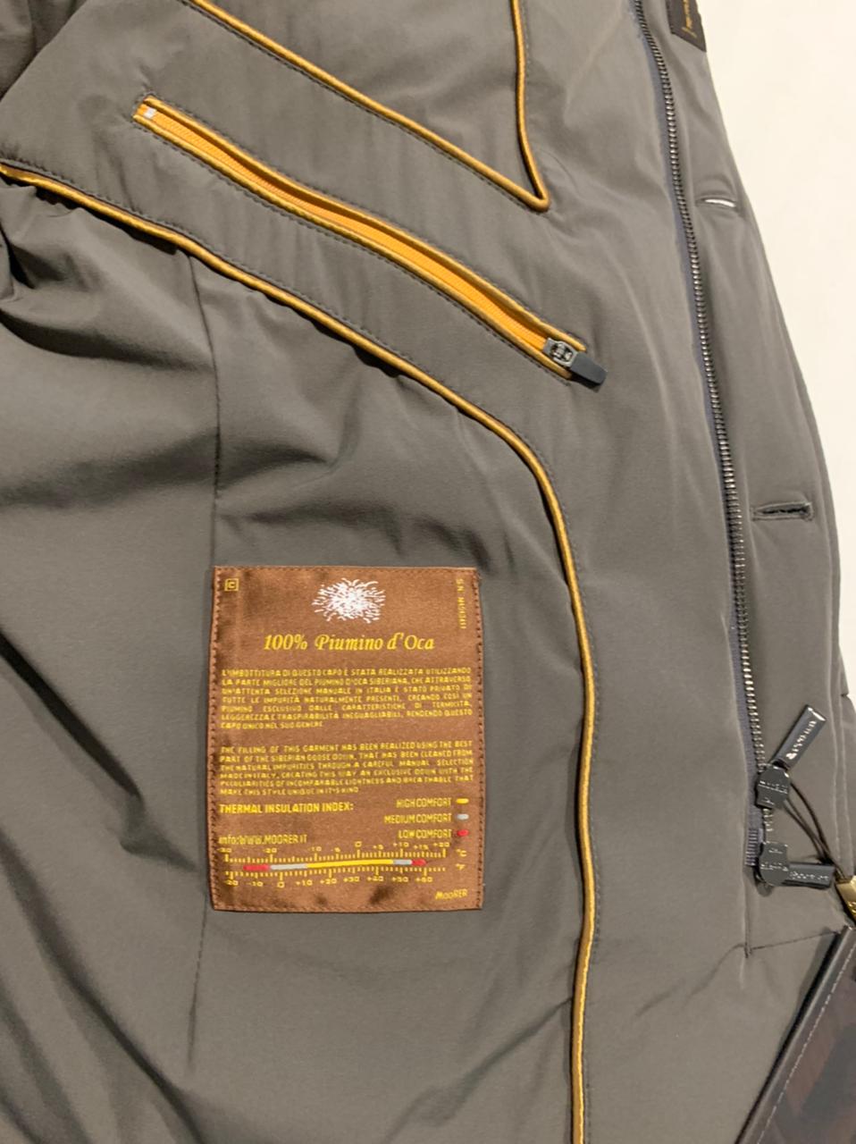 Продается новый мужской пуховик c имитацией пиджака итальянского бренда MOORER превосходного исполнения, цвета кофе с молоком, однобортная модель с лацканами, из водоотталкивающей ткани, логотип, застегивается на молнию с двойным ходом и пуговицы с логотипом бренда, два наружных кармана с клапанами, два внутренних кармана на молнии и пуговице с логотипом бренда, внутри пух , соотношение пуха и пера 95/5 , рассчитан на температуру до -16 градусов, состав: 88%, полиамид, 12% полиуретан, все бирки и запасная фурнитура прилагаются , размер 56(IT) , производство Италия.