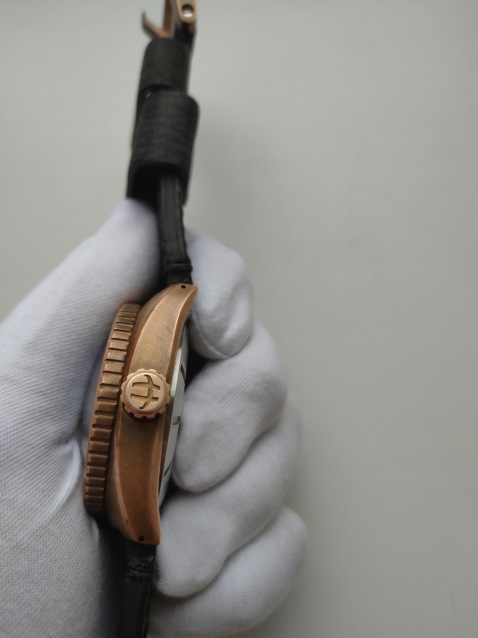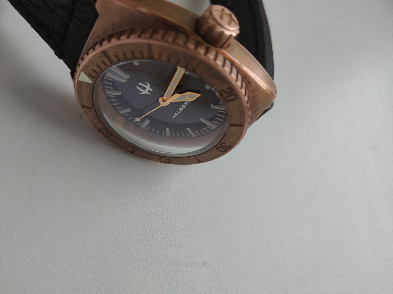В продаже бронзовая мощь от немецкого производителя - H2O Helberg CH6. Лимитка уже давно распроданная на сайте производителя. В настоящий момент заказать такие часы в бронзовом корпусе невозможно. Модель на форуме известная и довольно популярная. На просторах много отзывов и обзоров про отличное качество исполнения, правильную красивую патину, шикарный купольный сапфир этих моделей. Скажу, что я тоже поддерживаю эти положительные отзывы- часы, правда, очень добротные и впечатления когда берешь их в руки очень даже на уровне