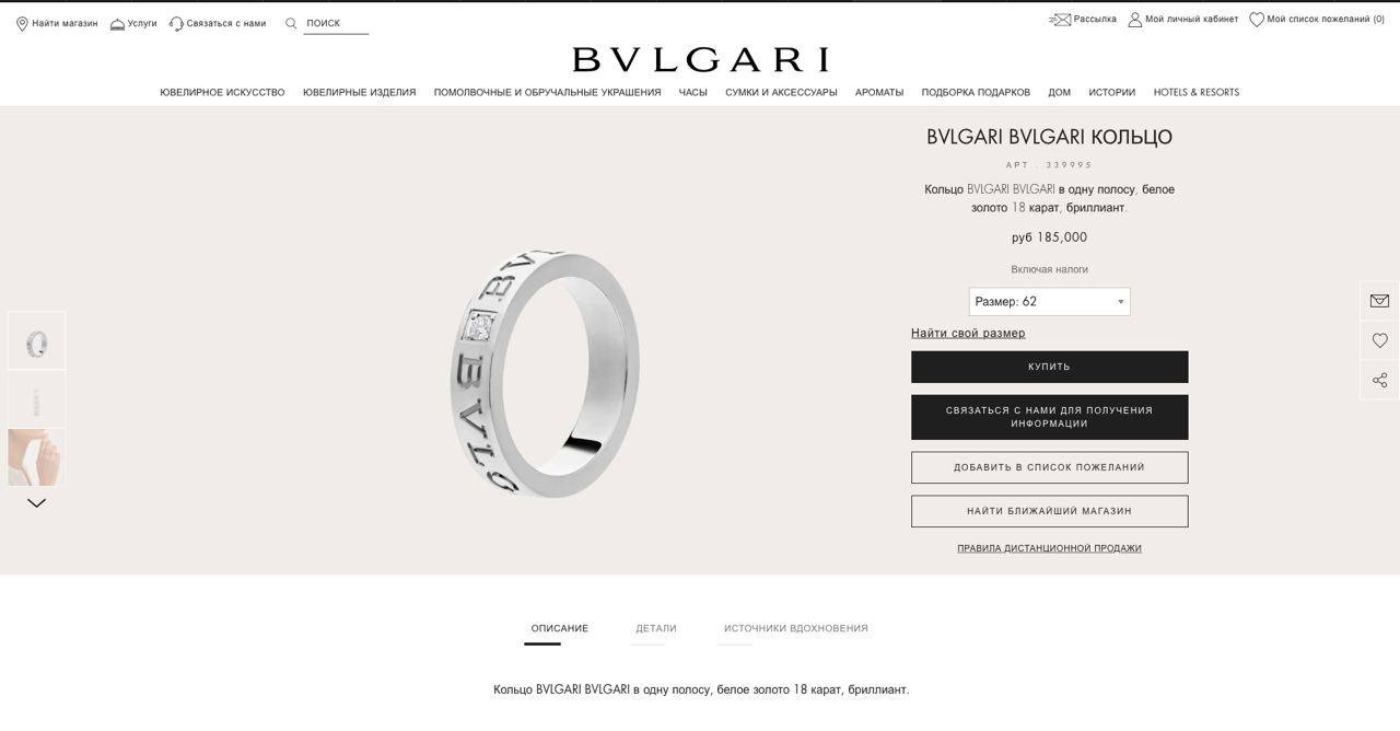 Кольцо *BVLGARI* BVLGARI в одну полосу, белое золото 18 карат, бриллиант (РАЗМЕР 19,5/ 62 )