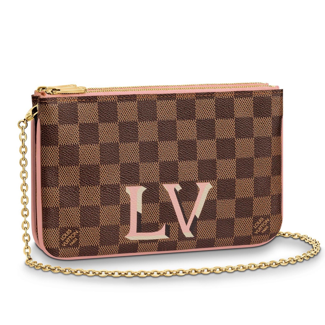 "Функциональная модель Double Zip имеет два отделения на молнии и дополнена вместительным внутренним отделением для принадлежностей которые должны быть под рукой. В версии из канвы Damier Ebene, модель дополнительно украшена выразительной графикой в виде легендарных инициалов LV. Деликатная отделка из кожи нежно-розового цвета подчёркивает лаконичный силуэт модели. Изысканный и универсальный аксессуар с двумя независимыми отделениями на молнии идеален для хранения смартфона и других важных принадлежностей, и великолепно дополнит дневной или вечерний образ в качестве эффектного клатча либо сумки на плечо или через плечо."