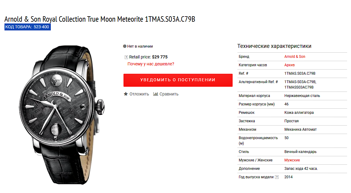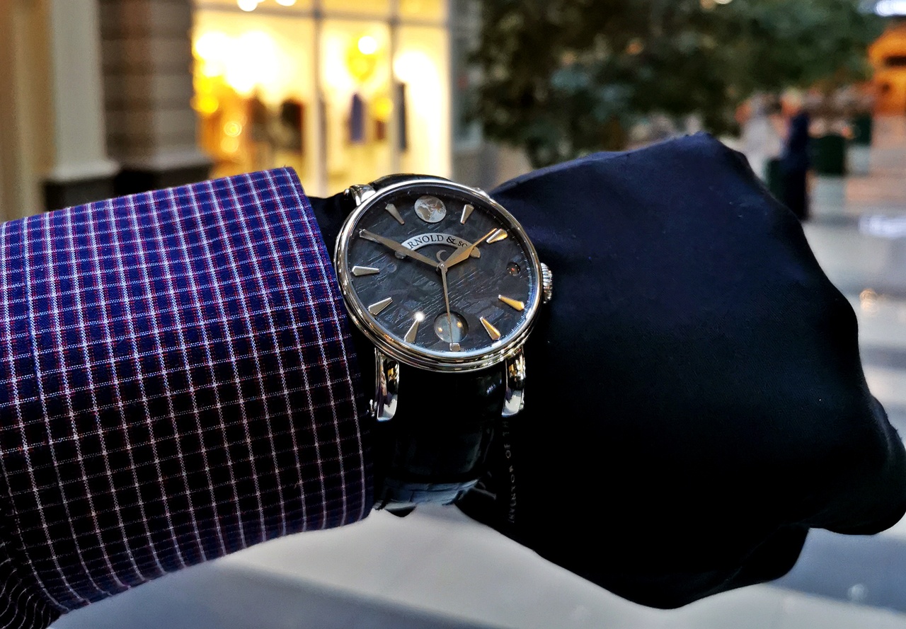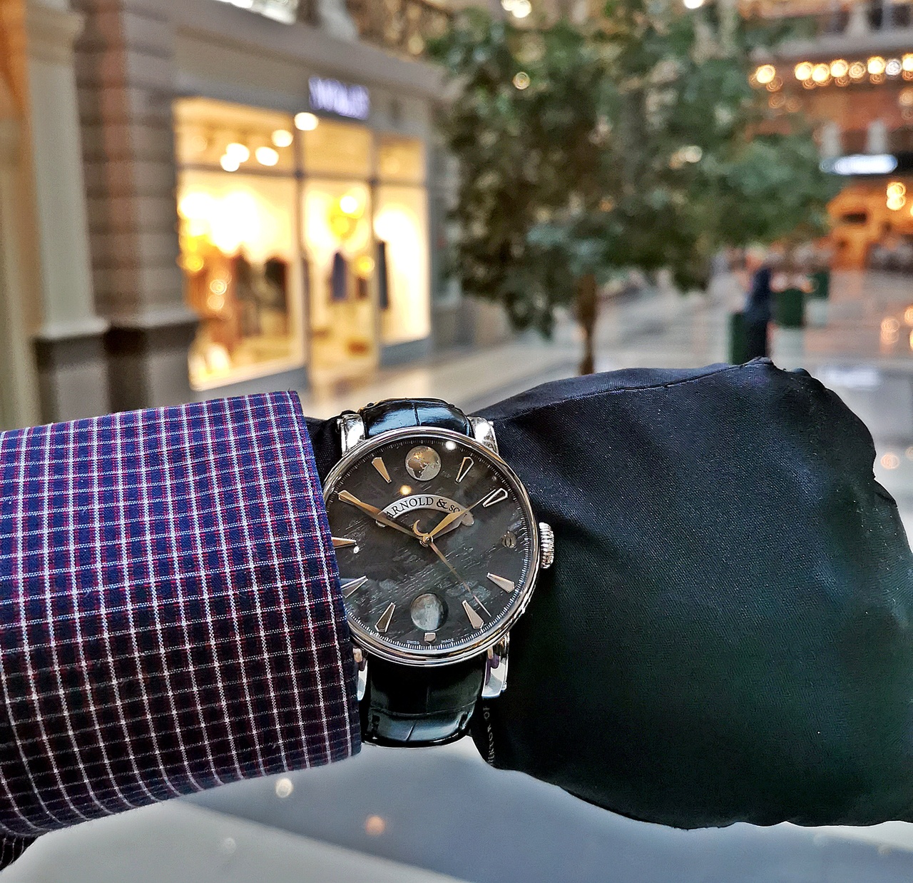 В продаже крупные и редкие мужские часы Arnold & Son в которых используются прогрессивные технологии и удивительным образом переплетаются с устоявшимся традиционным дизайном модельного ряда Royal Collection. Эта изысканная модель будет превосходно смотреться на запястье. Циферблат часов дополнен индикатором фазы луны. Модель поставляется в стальном корпусе размером 46 мм. Механизм с автоматическим подзаводом работает от амплитуды движения руки. Запас хода 42 часа. Эти часы с водонепроницаемостью 50 м позволят вам спокойно пережить дождик и брызги воды. Циферблат закрыт прозрачным антибликовым стеклом из сапфира, благодаря чему обеспечивается максимальная защита от сколов и механических повреждений. Ремешок из кожи аллигатора со стальной клипсой превосходно дополняет изысканный образ модели.