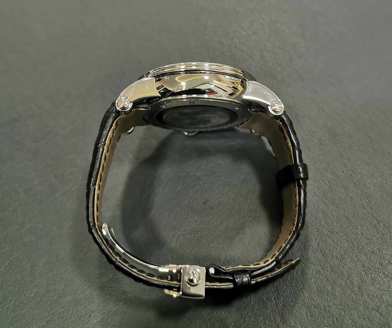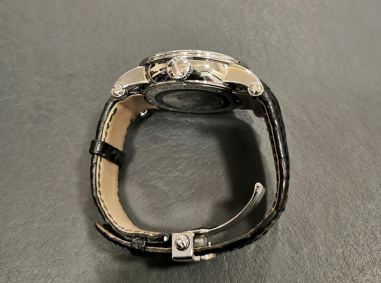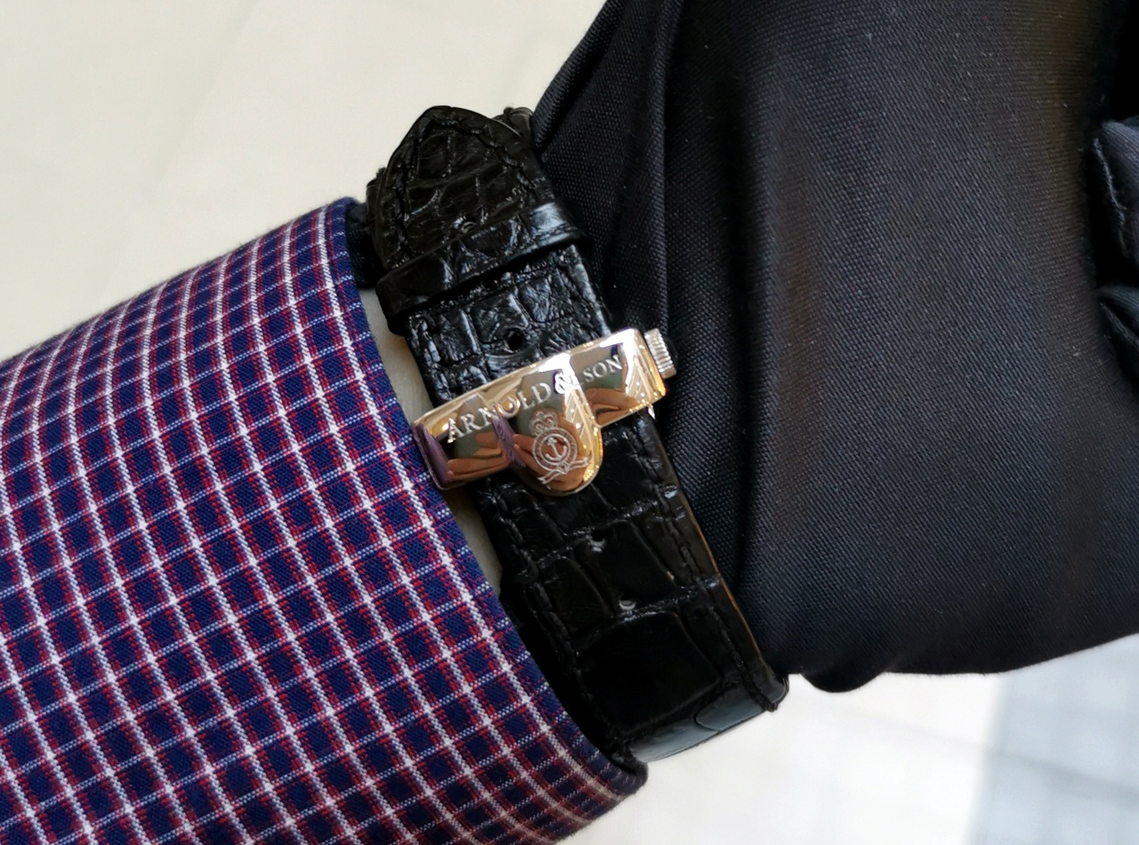 В продаже крупные и редкие мужские часы Arnold & Son в которых используются прогрессивные технологии и удивительным образом переплетаются с устоявшимся традиционным дизайном модельного ряда Royal Collection. Эта изысканная модель будет превосходно смотреться на запястье. Циферблат часов дополнен индикатором фазы луны. Модель поставляется в стальном корпусе размером 46 мм. Механизм с автоматическим подзаводом работает от амплитуды движения руки. Запас хода 42 часа. Эти часы с водонепроницаемостью 50 м позволят вам спокойно пережить дождик и брызги воды. Циферблат закрыт прозрачным антибликовым стеклом из сапфира, благодаря чему обеспечивается максимальная защита от сколов и механических повреждений. Ремешок из кожи аллигатора со стальной клипсой превосходно дополняет изысканный образ модели.