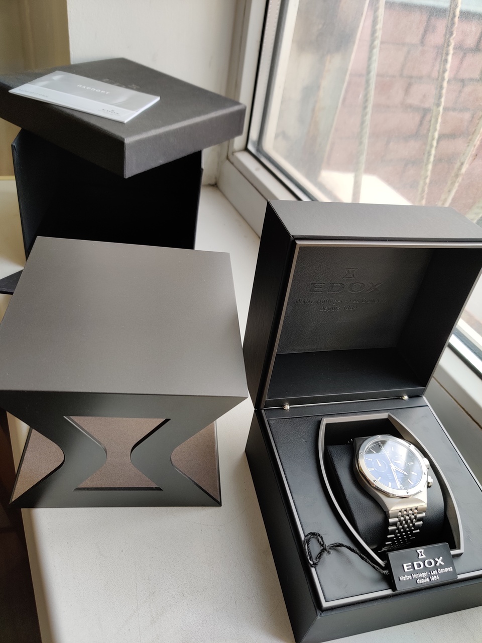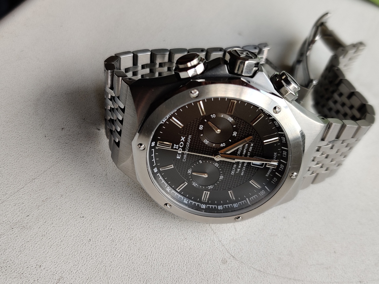 Продам часы Edox Delfin Chronograph 10108, кварц, 200 метров. Покупал новые в 2017. Носил с разной степенью интенсивности. Состояние видно на фото. Браслет подогнан на запястье 16.5-17см, но в комплекте сохранились все звенья, так что увеличить не проблема.