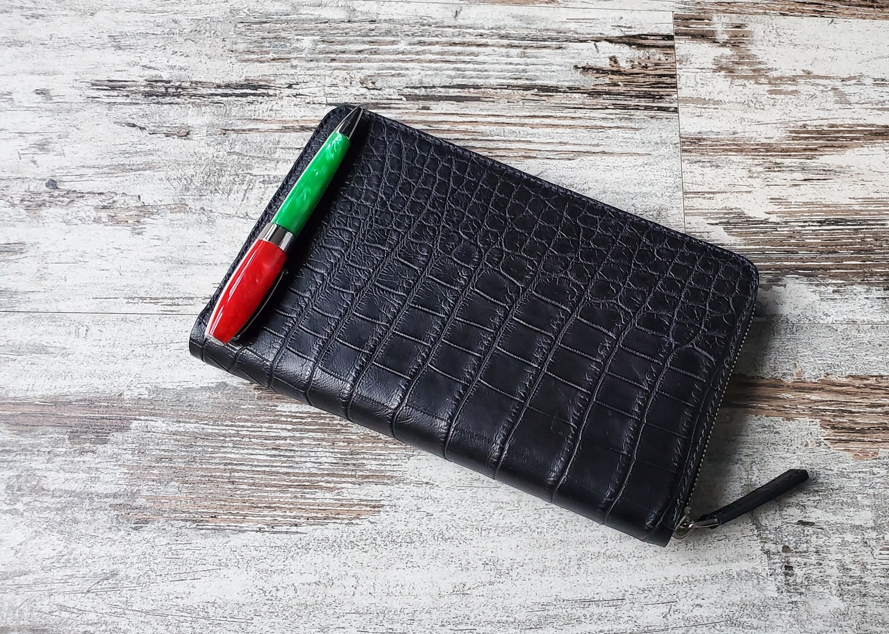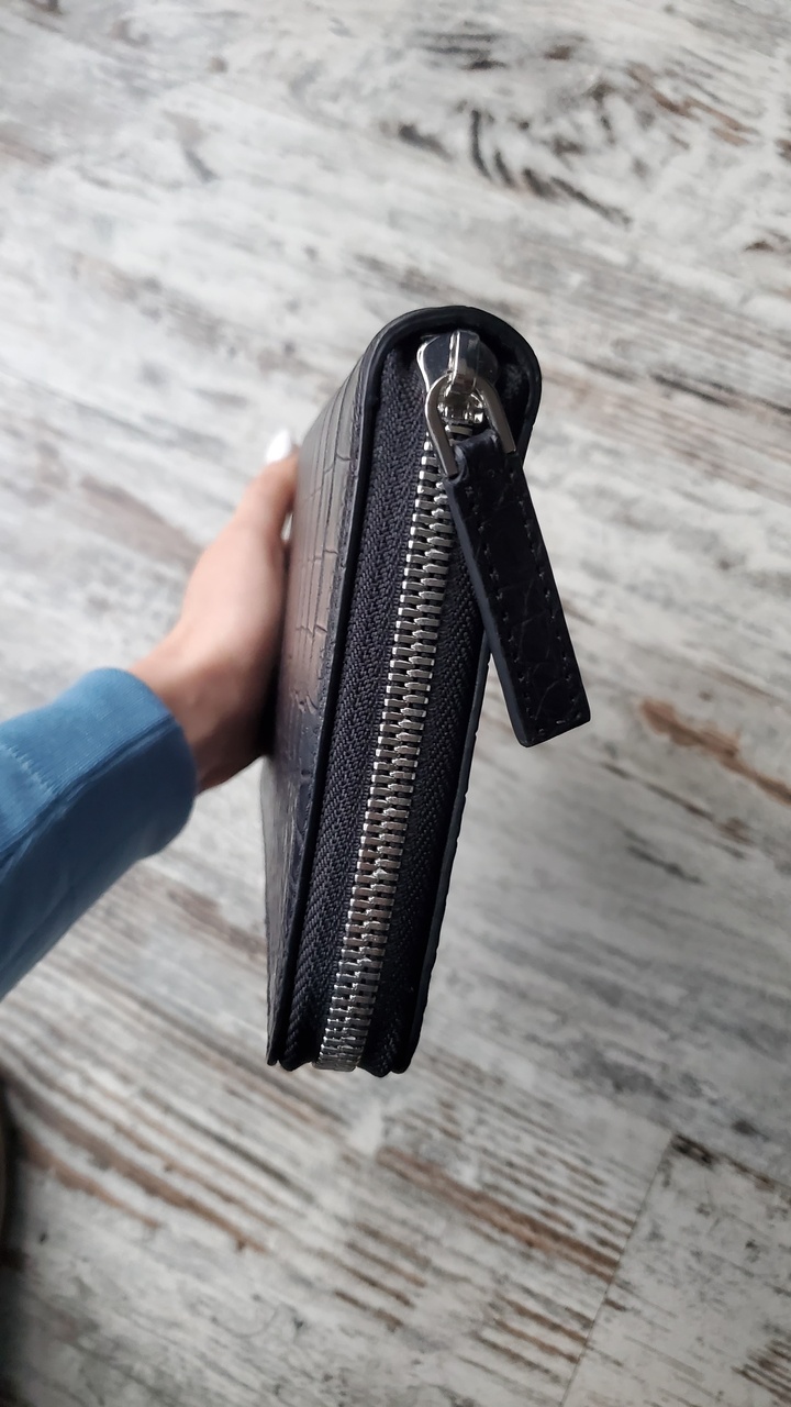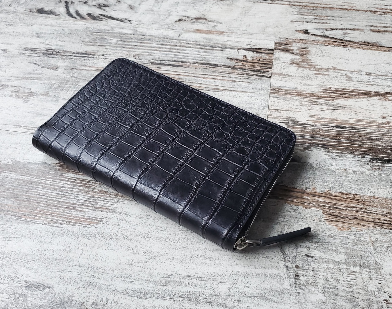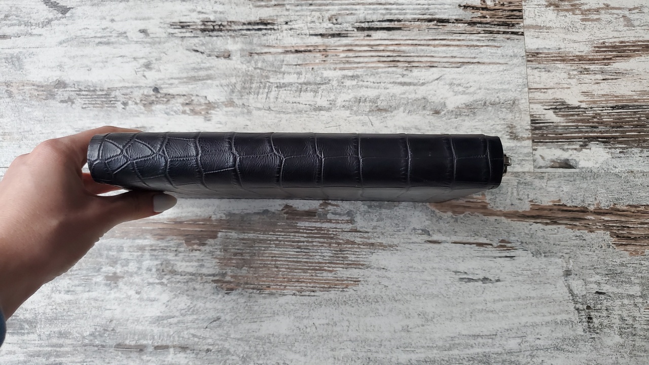 Клатч изготовлен из 100% кожи нильского крокодила высочайшего качества выделки с матовой поверхностью, из цельного куска с живота рептилии, окрашенной полностью вручную в чёрный цвет.