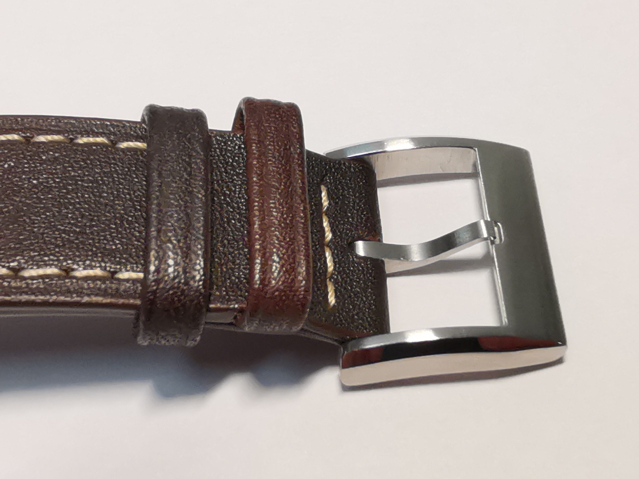 Ремешок кожаный трехслойный, пропитки от влаги, похоже, не имеет(намокает с разводами). Запах кожи присуствует. Прострочен нитками кремового цвета. Бакля на ремешке стальная, очень аккуратная, без острых кромок, вся шелково сатинирована, боковые фаски полированы. Вообщем ремешок хороший, если не мочить. Впрочем, производитель, видимо зная недостатки ремешка, приложил дополнительный натовский ремень к часам.