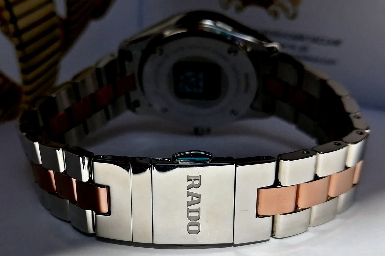 Оформление: Антибликовое покрытие стекла, корпус размера S, безель и центральный ряд звеньев браслета - Ceramos™ цвета жёлтого золота, стильный перламутровый циферблат украшен 12ю бриллиантовыми метками и стрелками цвета желтого золота с люминесцентным покрытием Super-LumiNova, всё это очень приятно смотрится с жёлтым керамическим безелем и шикарным мягким браслетом.