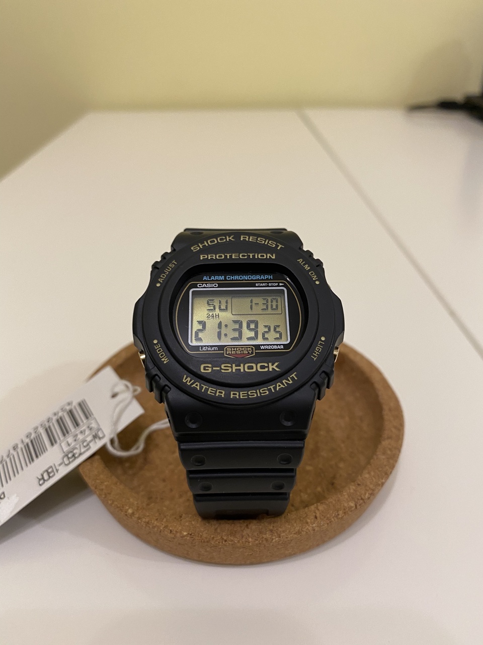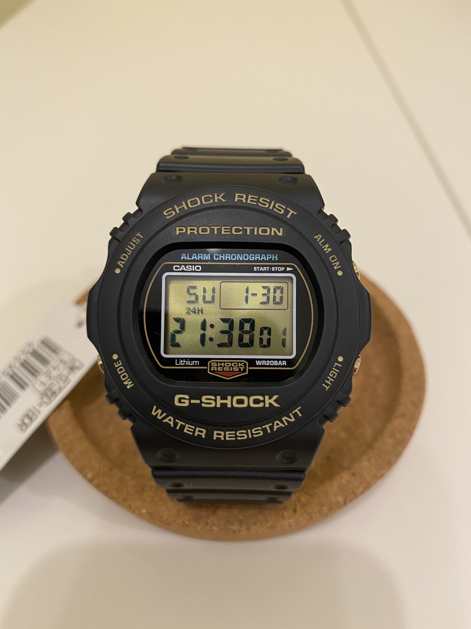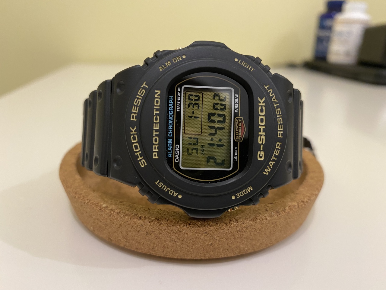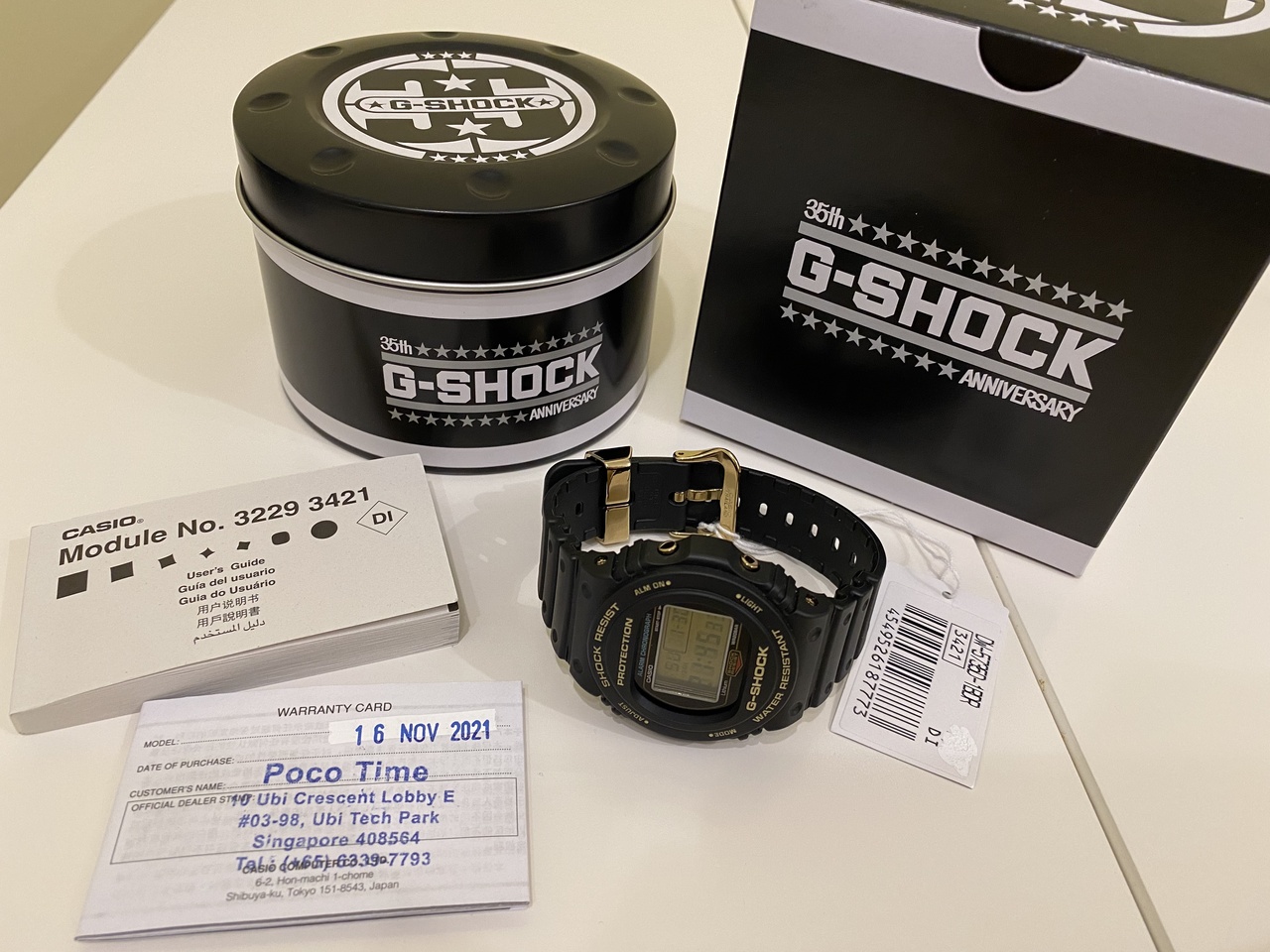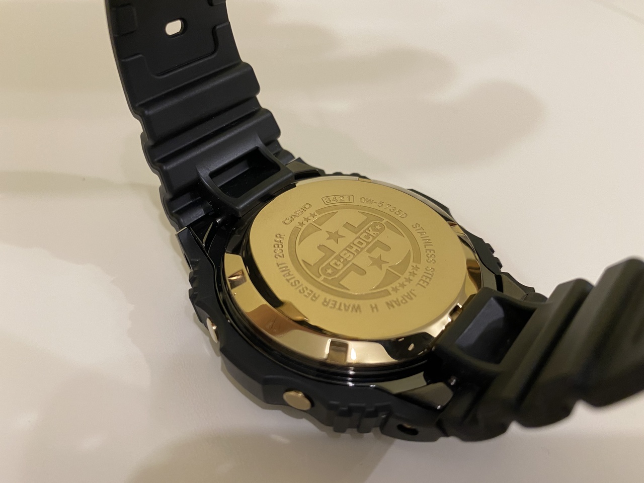 Это редкая юбилейная модель, выпущенная к 35-летию бренда G-Shock. Лимитированная линейка Origin Gold. Стальной(!) корпус с чёрным IP-покрытием + завинчивающаяся задняя крышка с IP-покрытием золотого цвета и красивой гравировкой (см. фото). Все прочие металлические части: пряжка, бакля с юбилейной гравировкой, кнопки и даже винтики - везде такое же ионизированное покрытие золотистого цвета. Циферблат тоже уникальный: тот же золотистый цвет плюс покрыт микрорешеточкой, которая создаёт на свету красивый переливающийся эффект. Кстати, четкость и контрастность циферблата выше, чем у стандартных DW-5600.