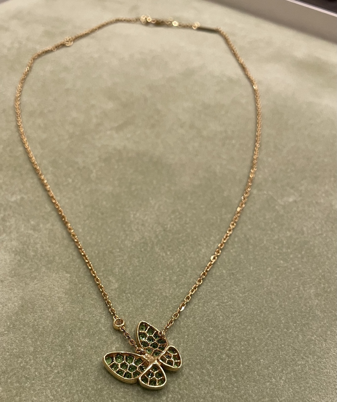 Оригинальная подвеска Two Butterfly из желтого золота, цаворита (редкий ярко-зелёный гранат, прозрачная разновидность гроссуляра) и бриллиантов круглой огранки и огранки «маркиза». Это великолепное украшение из коллекции Fauna, созданная под знаком бабочки- легендарного талисмана души и вечности.