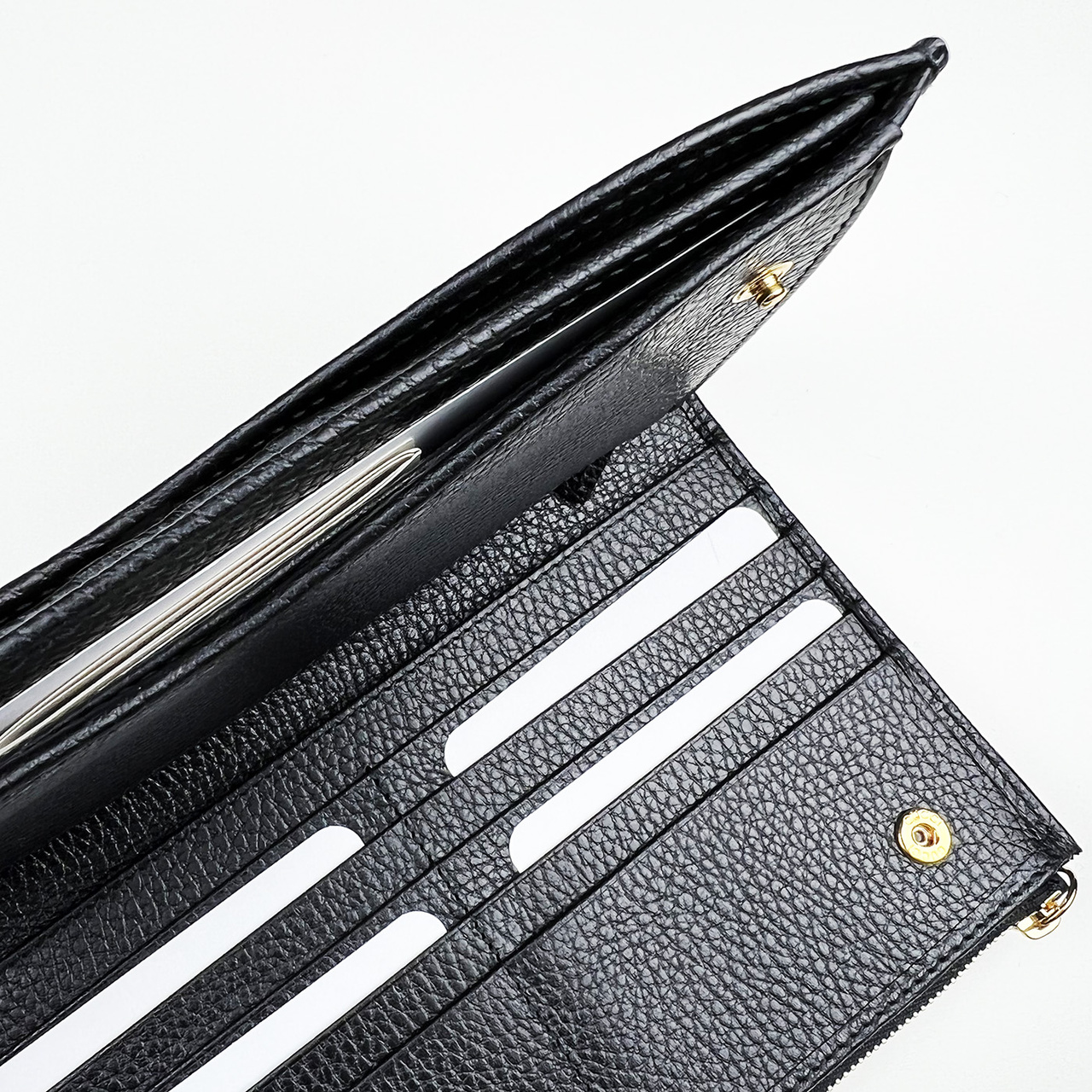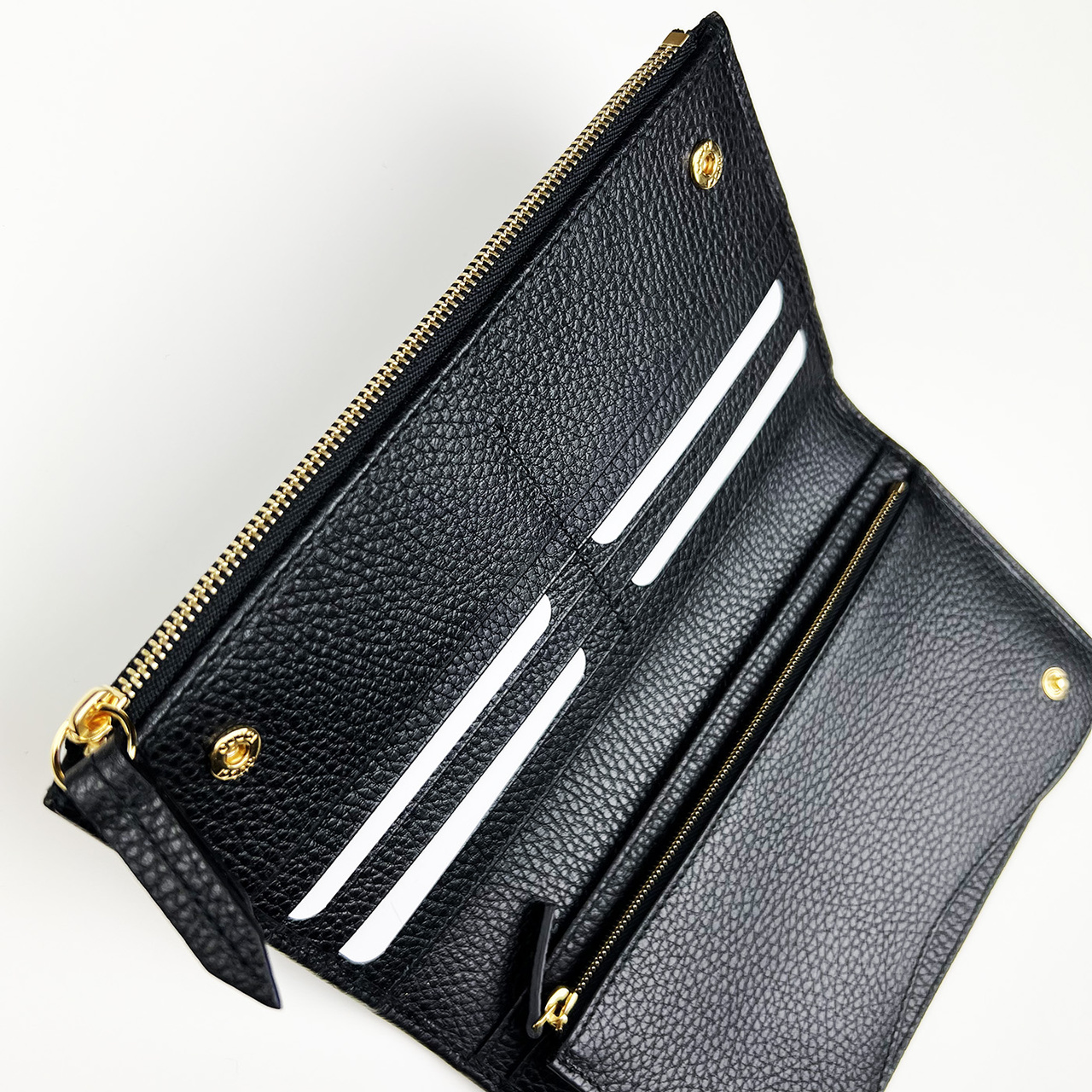 Клатч эффектно выглядит и имеет отличную функциональную организацию внутреннего пространства. Широко удобно раскрывается - на 180 градусов. Внутри размещены отделения для купюр, карманы и кармашки, слоты для карт, чеков и т.п., а также отделение на молнии, плюс торцевое основное отделение на молнии для купюр - которое расположено таким образом, что его можно открывать именно молнией сверху, не раскрывая сам клатч, что очень удобно.