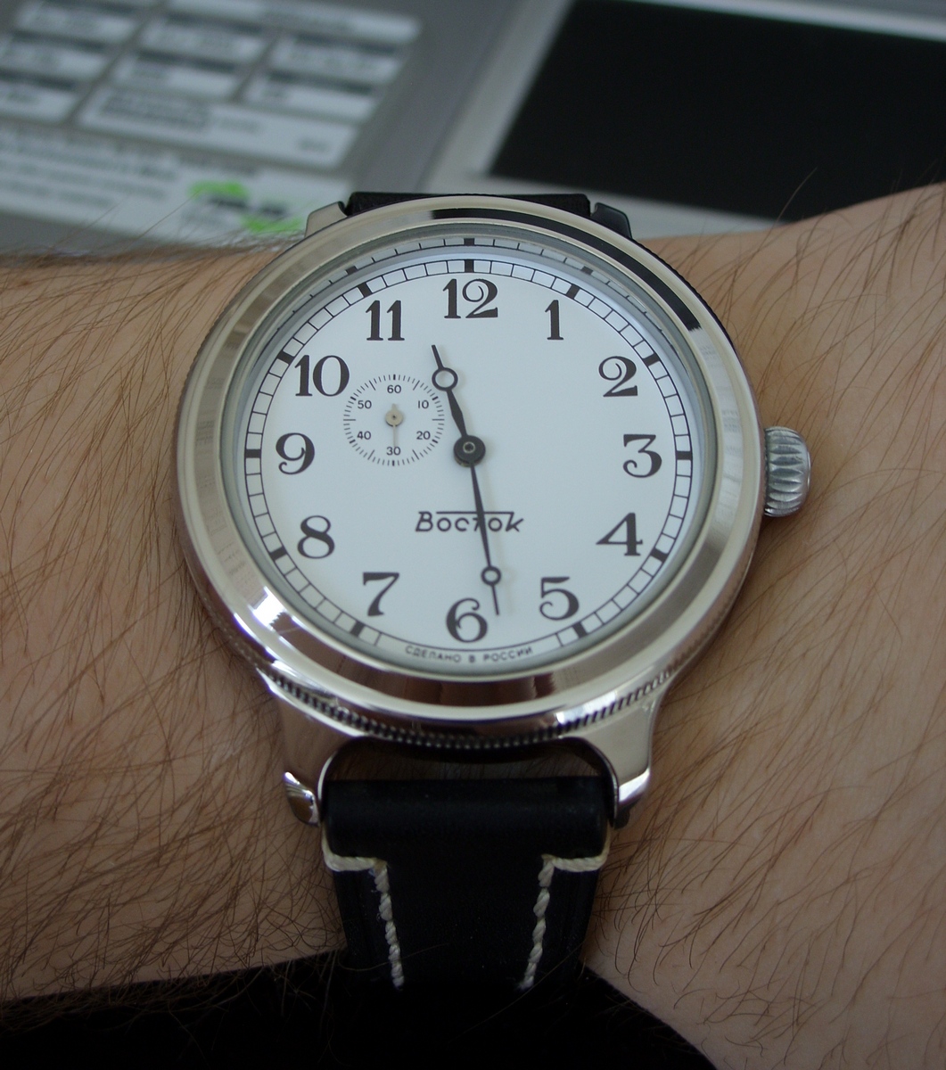 Читал и про Востоки, и про китайские корни Волмакса, и про особую любовь форумчан к японцам в случае, если бюджет покупки колеблется в районе 200$, и про Panerai почитал. Со временем у меня «сложились» вкусы, я чётко знал, что именно я хотел. Непременно русские часы, механика (ручка предпочтительней, но и против автомата ничего не имею против), белый циферблат, стрелки с яблоками Бреге, не хронометр, достаточно массивный размер, глухая, а не прозрачная задняя крышка, предельно лаконичный дизайн циферблата без даты и прочих мелочей, ремень, а не браслет.
