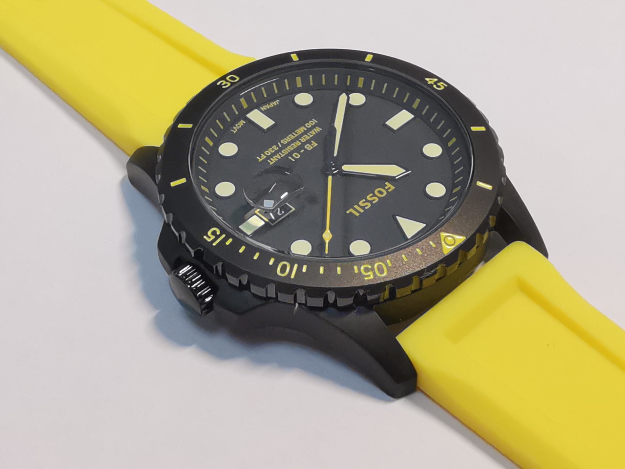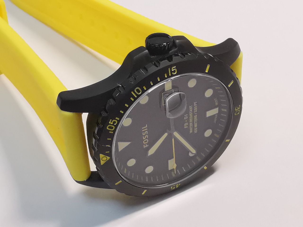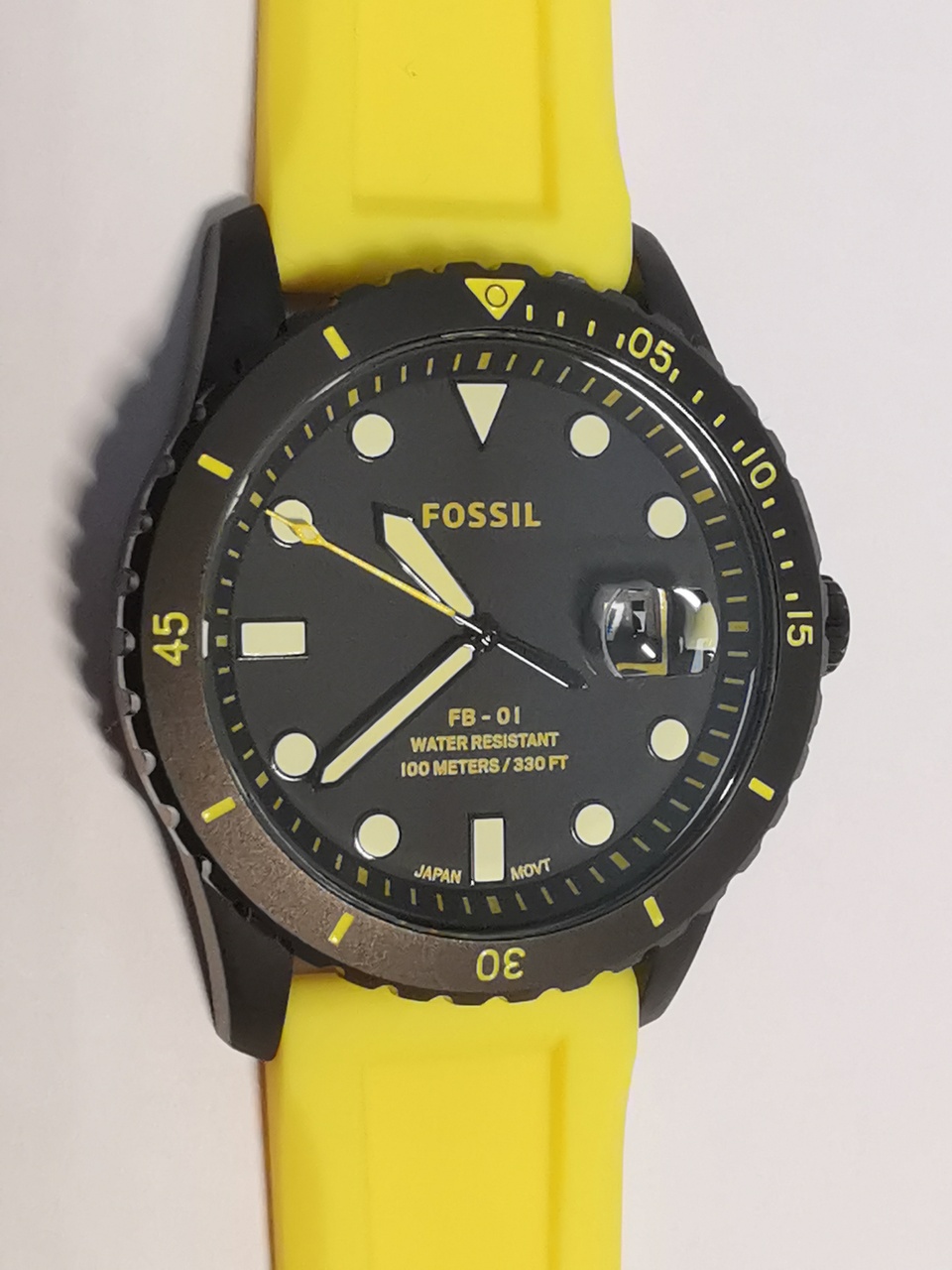 К весеннему периоду я неспешно присматривал часы-аксессуар желтого цвета. Среди кандидатов я рассматривал: Steeldive, Brigada, Heimdallr и кварцевые Fossil. У каждого варианта есть свои привлекательные стороны, но судьба распорядилась так, что экономически мне выгодно было выбрать последний,- а именно Фоссил. Сомнения меня терзали в основном по внешнему виду часов. Оформление циферблата намекает на причастность модели к дайверскому направлению дизайна. Утонченные ушки и неширокий, не поворотный безель, не усиливают этого впечатления. Но, данная модель скорее модный аксессуар, чем инструмент, хотя и выполнен достаточно добротно для своей ценовой категории. Пожалуй, главным в данной модельной линейке является цветовой акцент. Силиконовый ремешок в первую очередь привлекает внимание. Думаю, что на темном ремешке эти часы с большой натяжкой можно было бы назвать желтыми. Сами часы не тяжелые, довольно изящные, вероятно, нацелены на молодежную аудиторию. Вариантов цветовых комбинаций данной модели корпуса у Фоссила довольно много, - это черные корпуса с одним цветовым акцентом, серебристые с двумя и более цветами в оформлении.