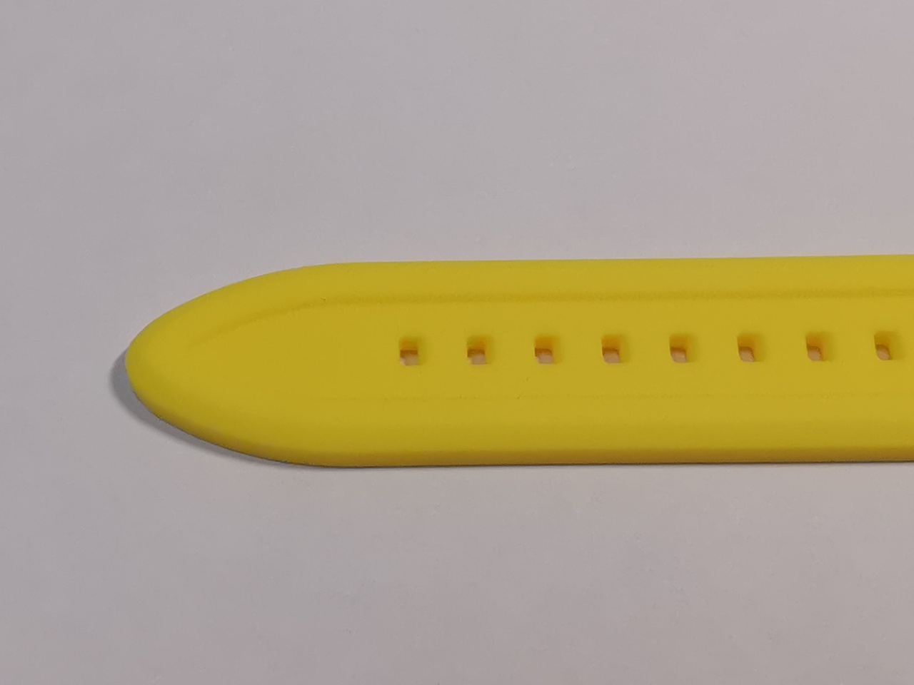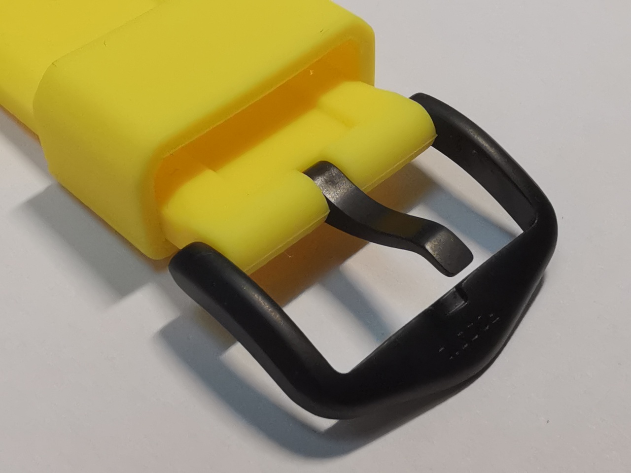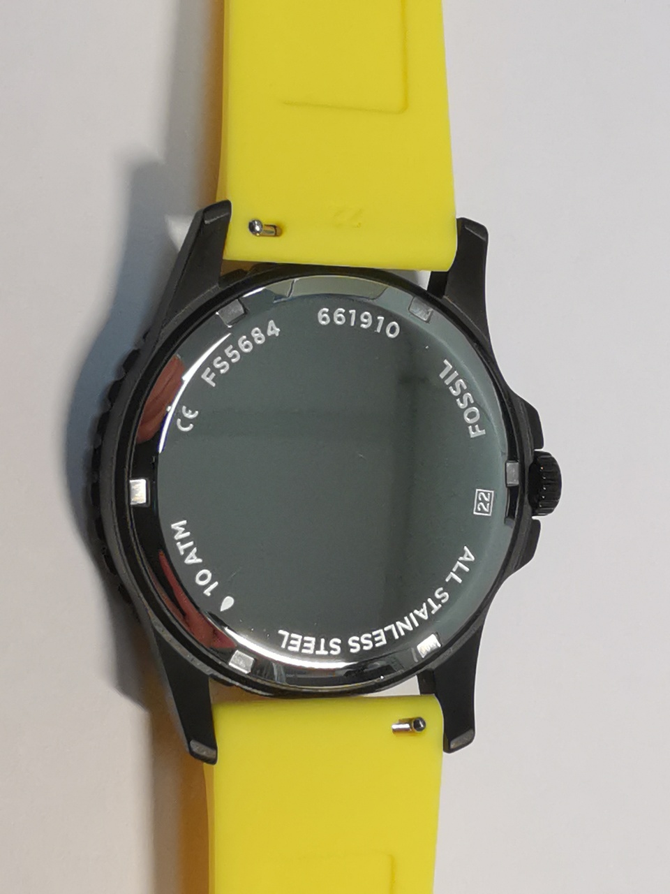 Ремешок из желтого силикона, слегка бархатистый на ощупь, довольно упругий, имеет широкую канавку по середине и крупную фаску по периметру. С внутренней стороны ремешка имеется брендовое клеймо в ромбике. Бакля вероятно литая из нержавеющей стали, черного цвета, матированная. С внутренней стороны бакли имеется гравированная надпись Stainless steel. С лицевой стороны гравированное имя бренда - Fossil.