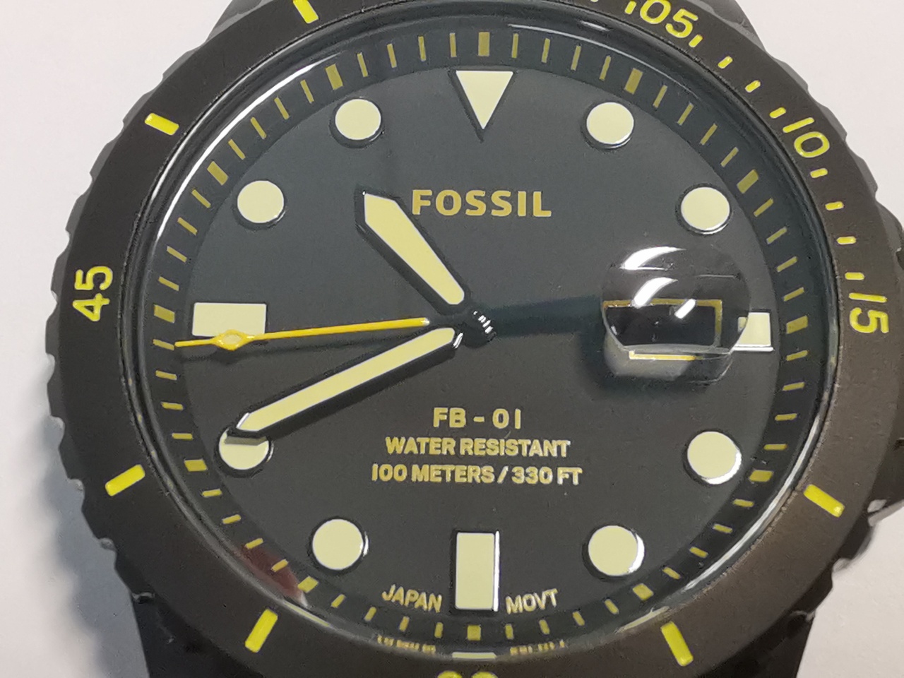 Надписи на циферблате : Fossil, FB-01, water resistant 100 meters/330ft, japan movt, - выполнены приглушенной желтой краской.