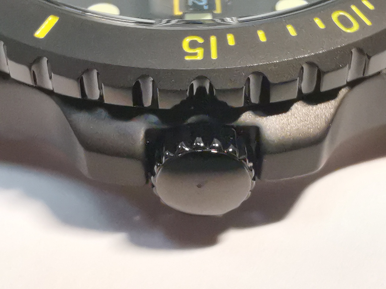 Безель стационарный, черного цвета, сверху матирован, по гурту полирован. Имеет декоративные насечки в виде крупных зубчиков. На верхней стороне безеля имеется разметка соответствующая основным минутным отрезкам. Разметка выполнена в дайверском стиле, углубления меток которой, заполнены желтой краской без люма.