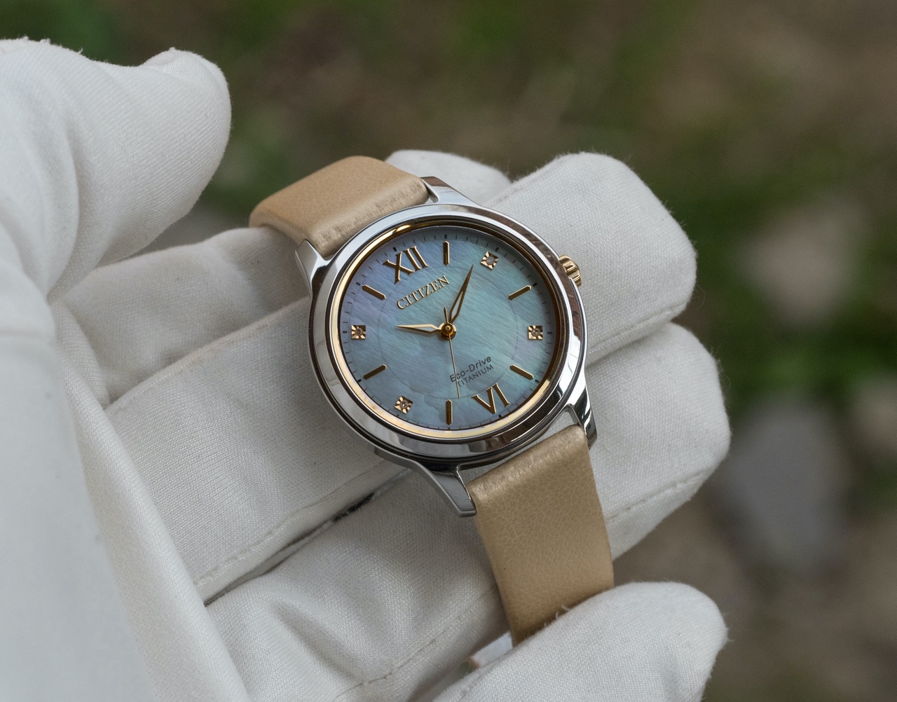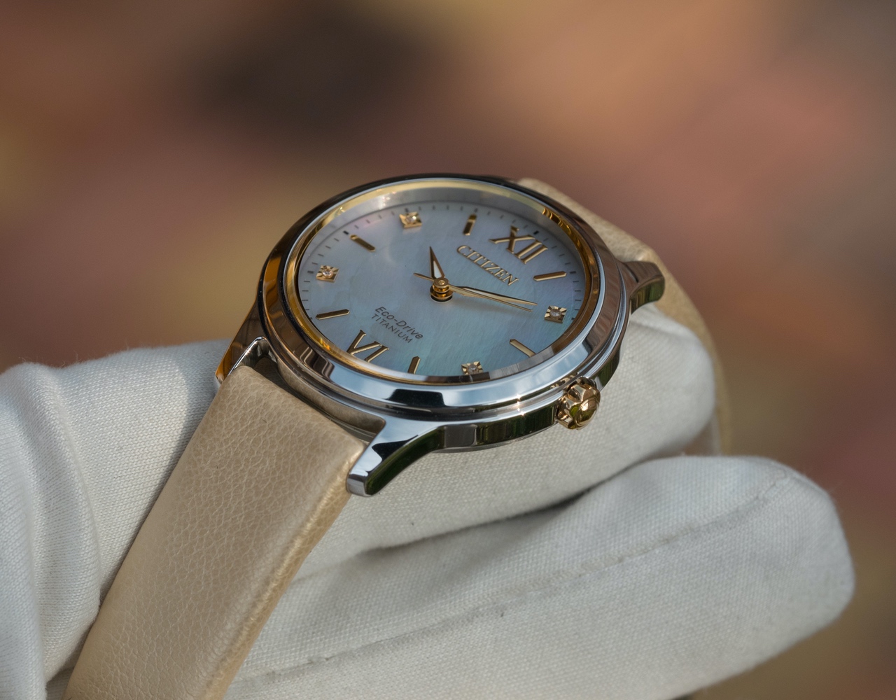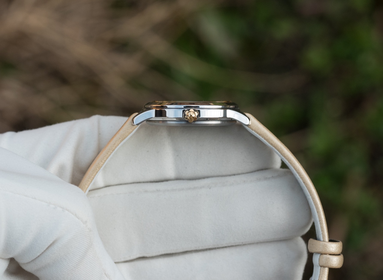Очень красивый перламутровый циферблат золотистыми акцентами
