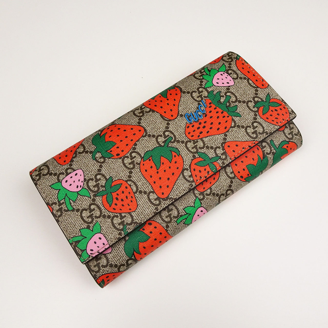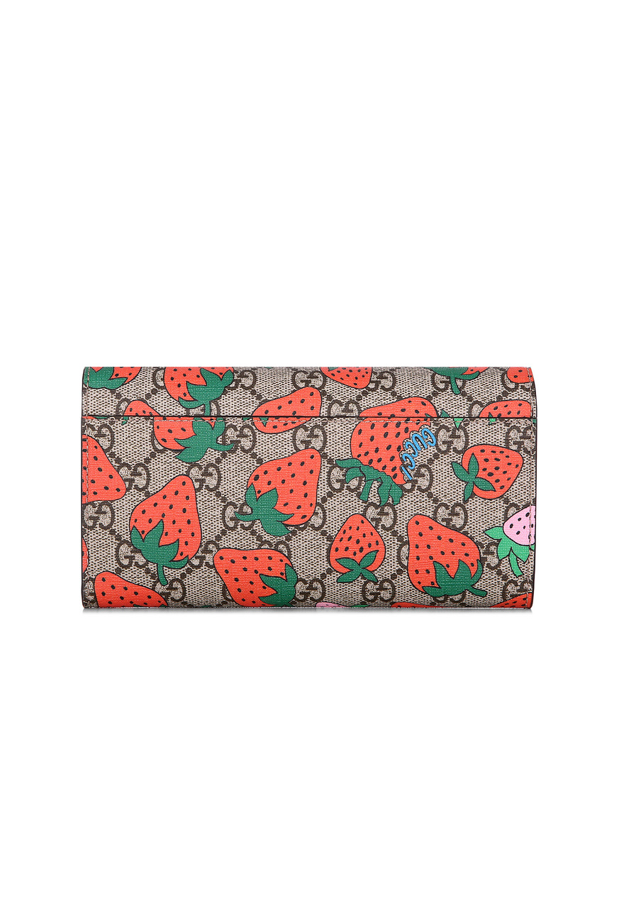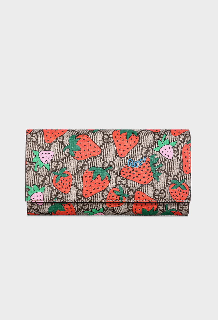 "Этот стильный кошелек изготовлен из фирменной канвы Gucci Supreme с монограммой GG, составленной из инициалов Гуччио Гуччи. Модель украшена крупным красно-розовым принтом с изображением ягод клубники. Перекидной клапан кошелька открывается, являя взору нарядное и вместительное внутреннее отделение позитивного розового цвета, с отделениям под купюры, отделением на молнии, и прорезями для пластиковых карт."