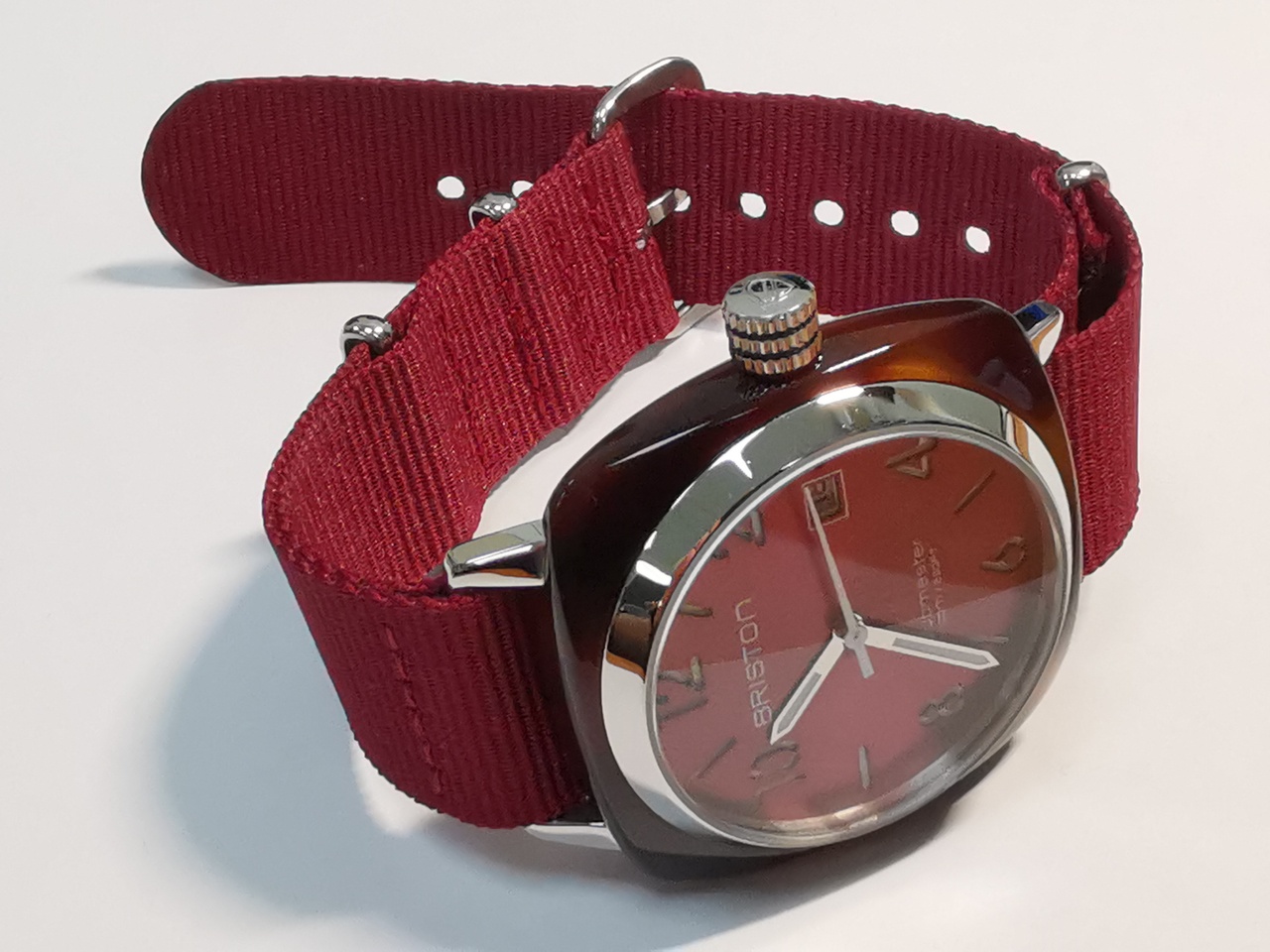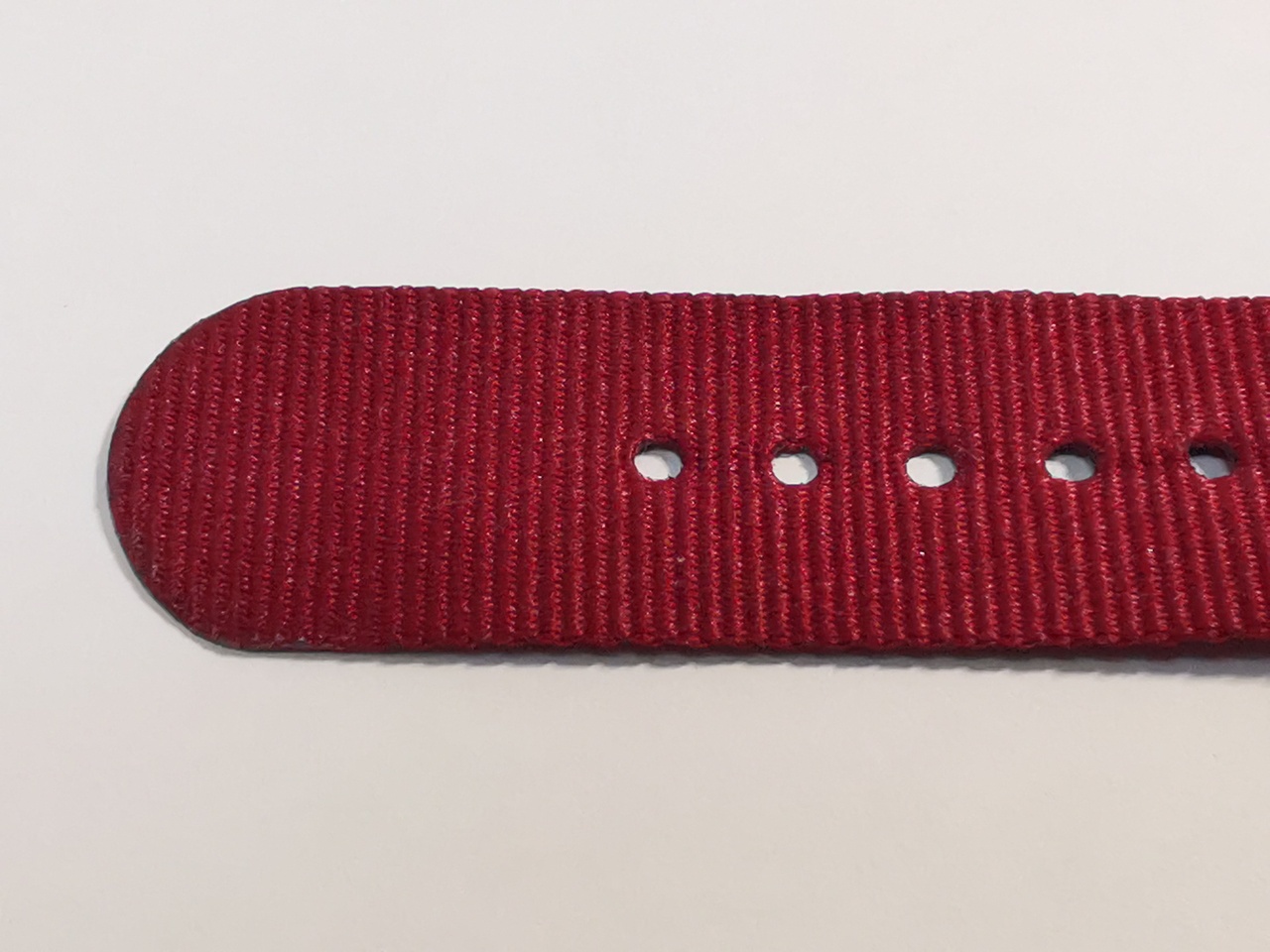 Ремешок у этих часов красного цвета(ближе к бардовому) шириной 20 мм, выполнен в стиле НАТО. Ремешок плотненький, но по ощущениям несколько тоньше тех, что прикладывает Сан Мартин к своим часам. Фурнитура ремешка выполнена из полированной стали, довольно изящно, без излишеств. Мне кажется, что если поменять ремешок на кожаный, то часы будут смотреться более брутально.